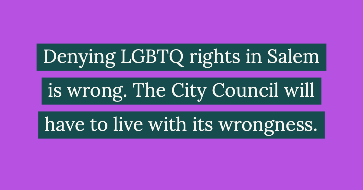I'm particularly disappointed in three progressive councilors (Chris Hoy, Cara Kaser, and Matt Ausec) joining forces with the three most conservative councilors (Jim Lewis, Brad Nanke, and Mayor Chuck Bennett) to deny LGBTQ rights in Salem.