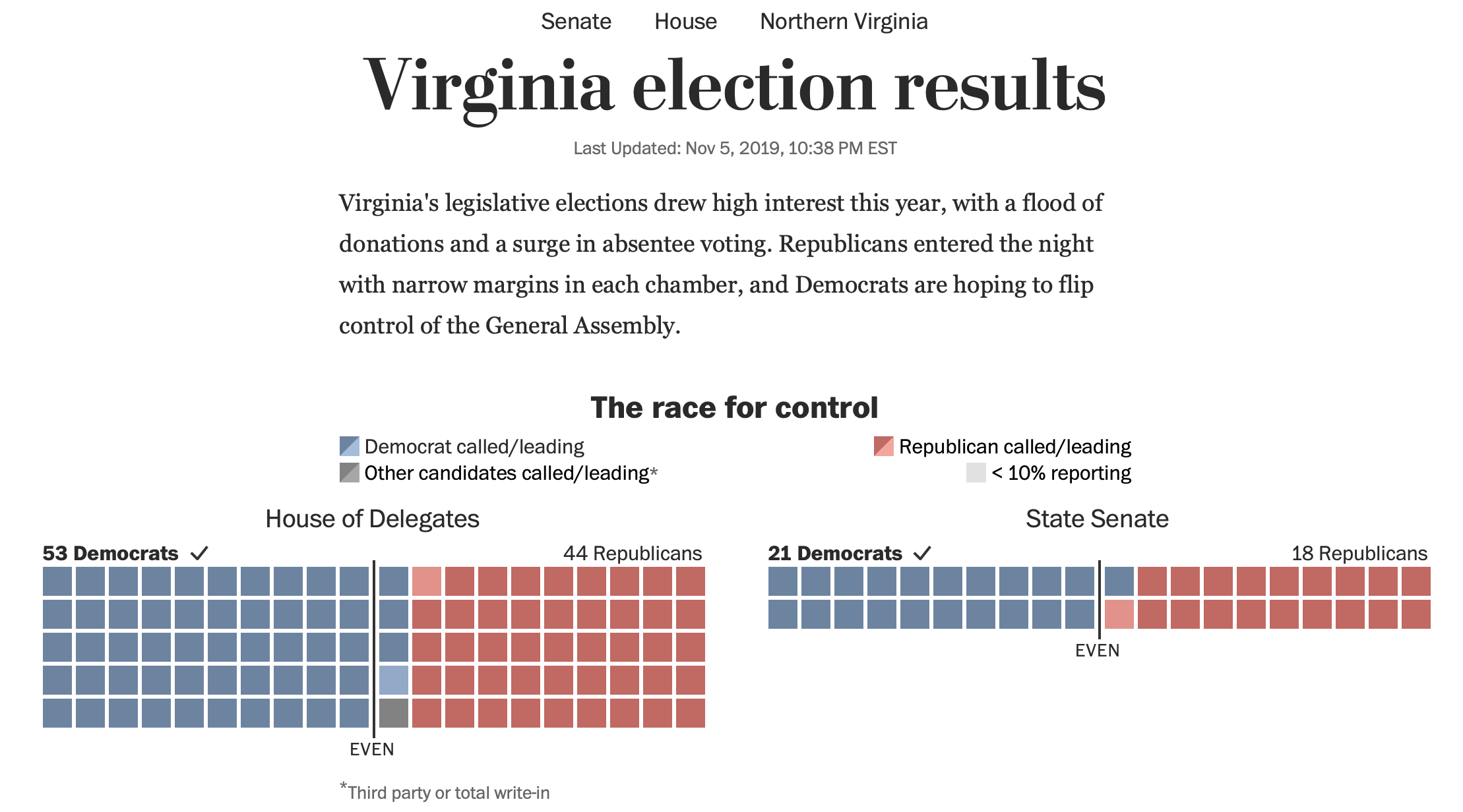 I'm also thrilled that for the first time in 26 years, Democrats control Virginia — Governor plus majorities in both the state House and Senate. So says this Washington Post graphic.