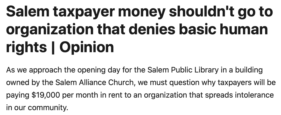 With so many suitable buildings available in Salem, there was no good reason to house a temporary library in the church-owned building. City officials simply thought that the controversy over paying an organization that discriminates against LGBTQ people would blow over.