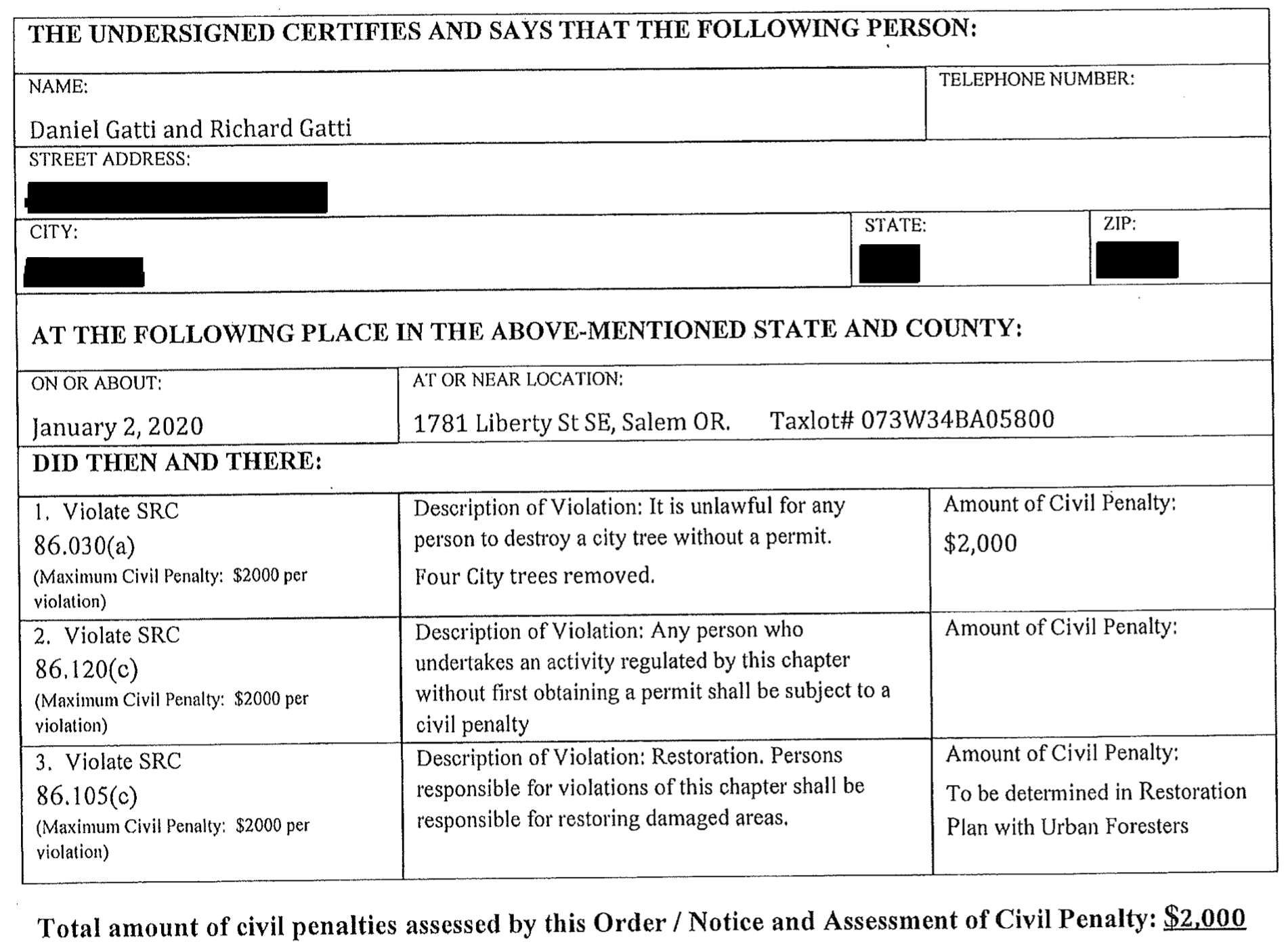 Today, after filing a public records request, I learned how much Daniel and Richard Gatti are being fined for destroying four street trees after failing to get a permit, as required by a City of Salem ordinance: $2,000, $500 per tree. Here's the PDF file I got.