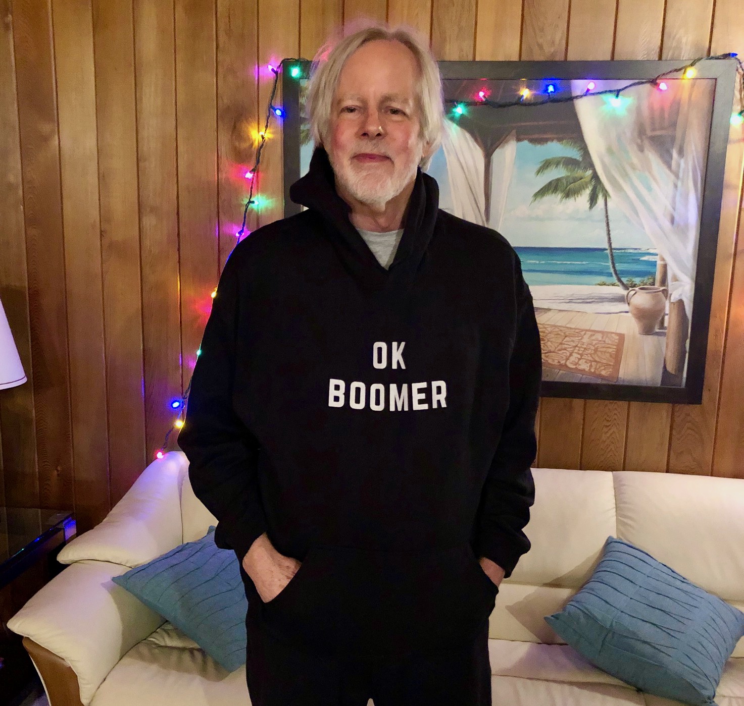 Brian Hines in OK Boomer hoodieMe, Brian Hines, a member of an older generation, trying not to look too complacent