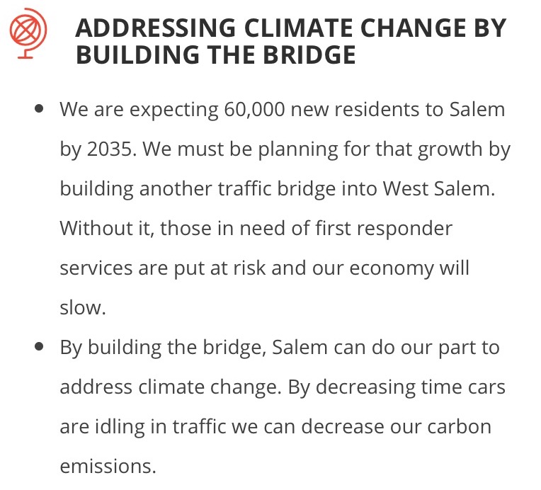 Reid Sund (Ward 7) and Jan Kailuweit (Ward 1) are claiming that building a 3rd Bridge across the Willamette would be a big contributor to lowering greenhouse gas emissions in Salem. Yes, they say, it is one of the best solutions we have in our “tool kit” for fighting climate change.