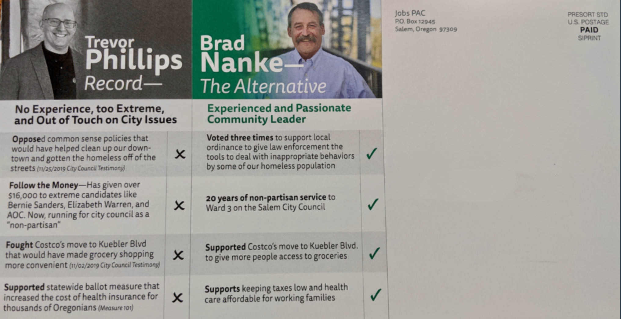 Of course, we don't know who hired the Public Affairs Counsel to use money from their Jobs PAC to send out the mailer attacking Trevor Phillips and supporting Brad Nanke. It's kind of hard to understand why a Salem City Council race would be of interest to the (apparently) statewide organizations in the paragraph above who have contributed big bucks to the Jobs PAC.