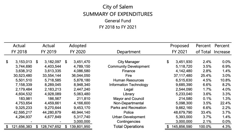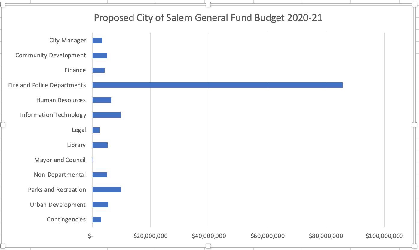 As I called for recently, the Salem City Council needs to take a close look at the FY 2021 City of Salem budget for the police department because that's by far the largest line item in the general fund budget. Black Lives Matter protesters have raised valid questions about whether police budgets around the country should be cut, much less raised, as the City of Salem is proposing.