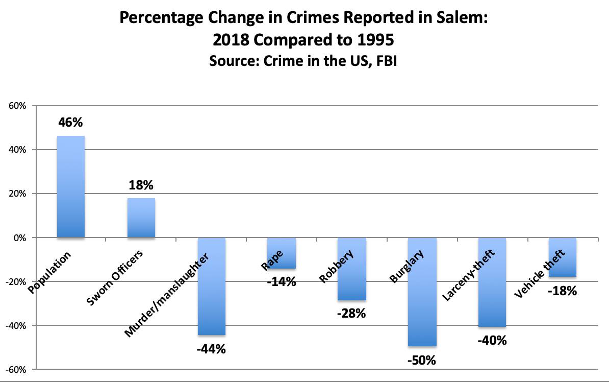 Comparing 1995 and 2018 Salem's population grew by 46% and crime dropped dramatically according to FBI data (click to enlarge). This is part of a well-known national trend.