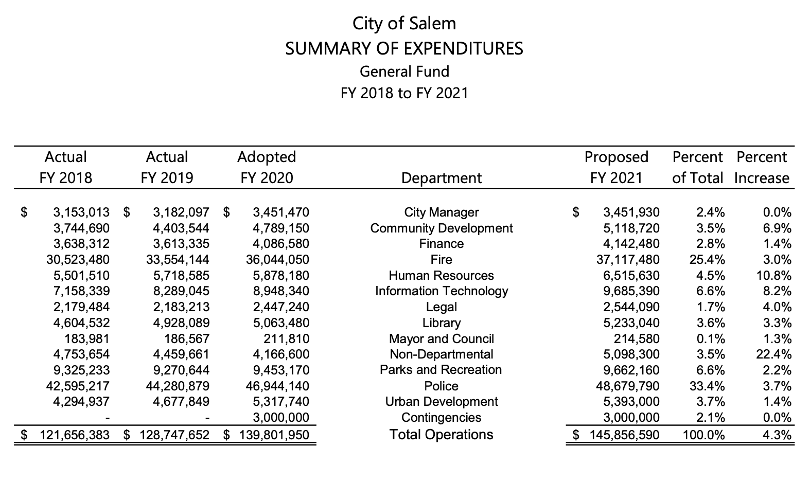 UPDATE: Ace researcher Jim Scheppke, a retired librarian, dug up a summary of the proposed next City of Salem budget that I couldn't find. Here it is, along with some observations Scheppke shared with me. I was correct that police and fire can consume more than half a city's general fund budget. For Salem it is a proposed whopping 59%.