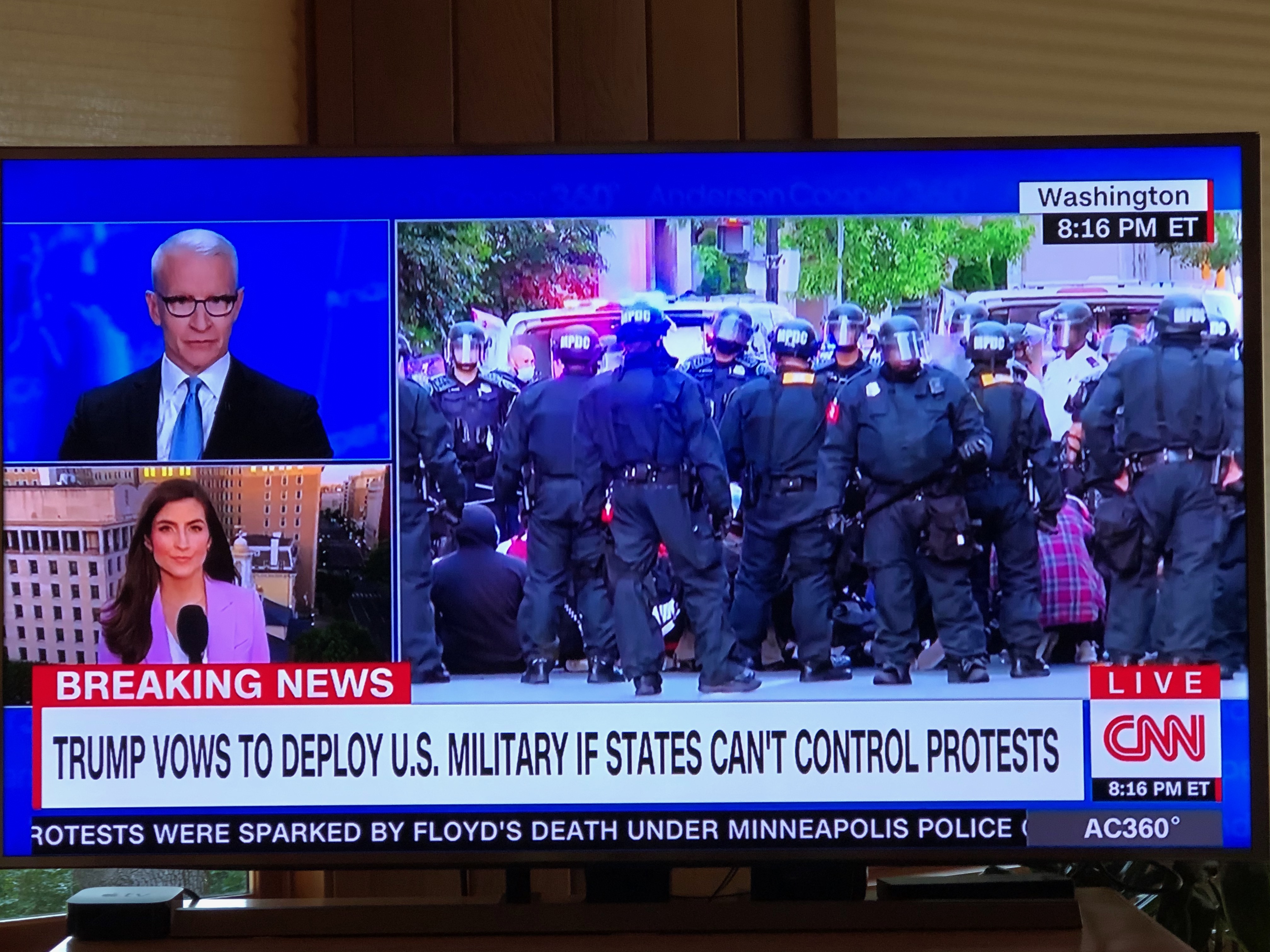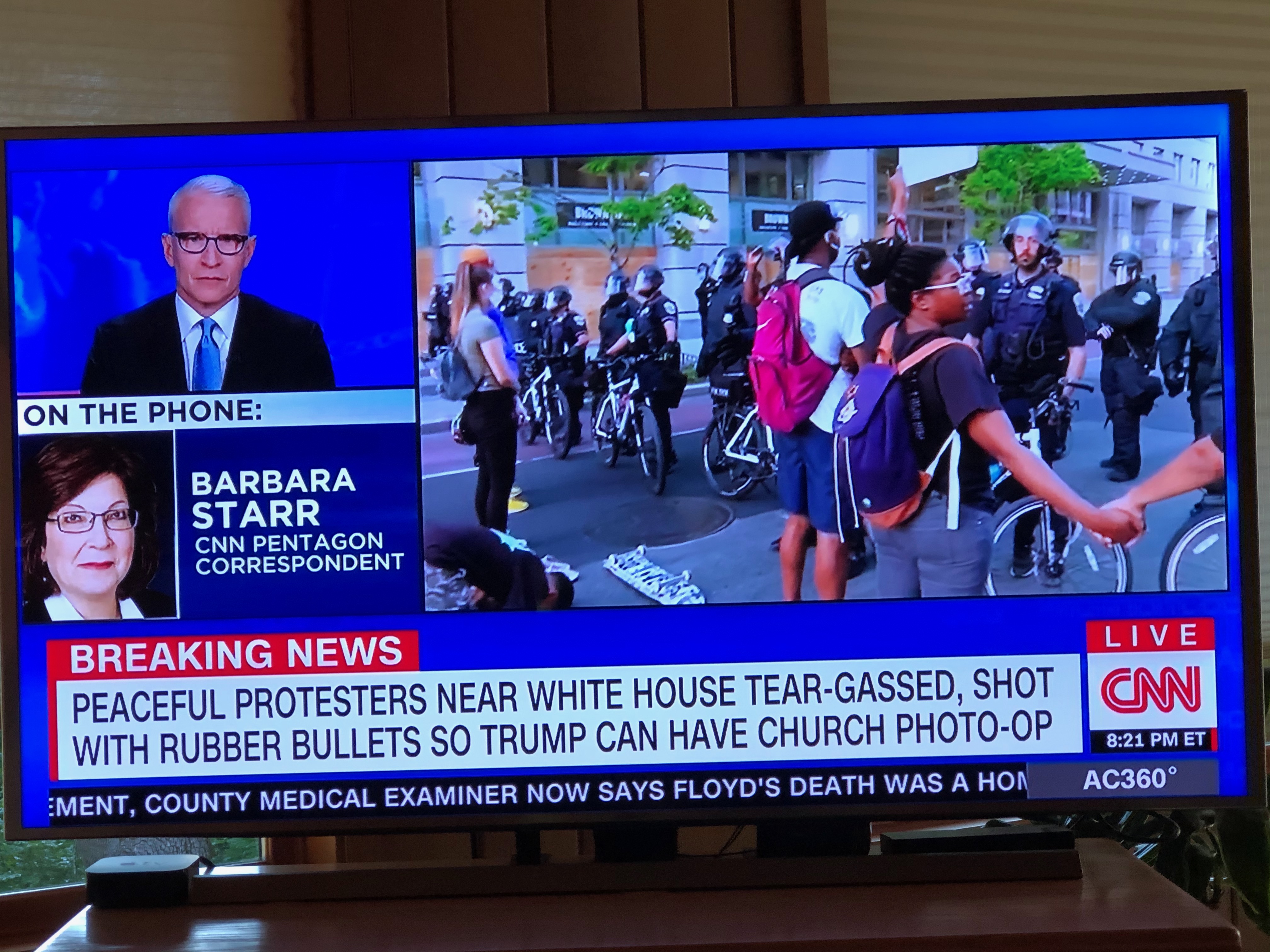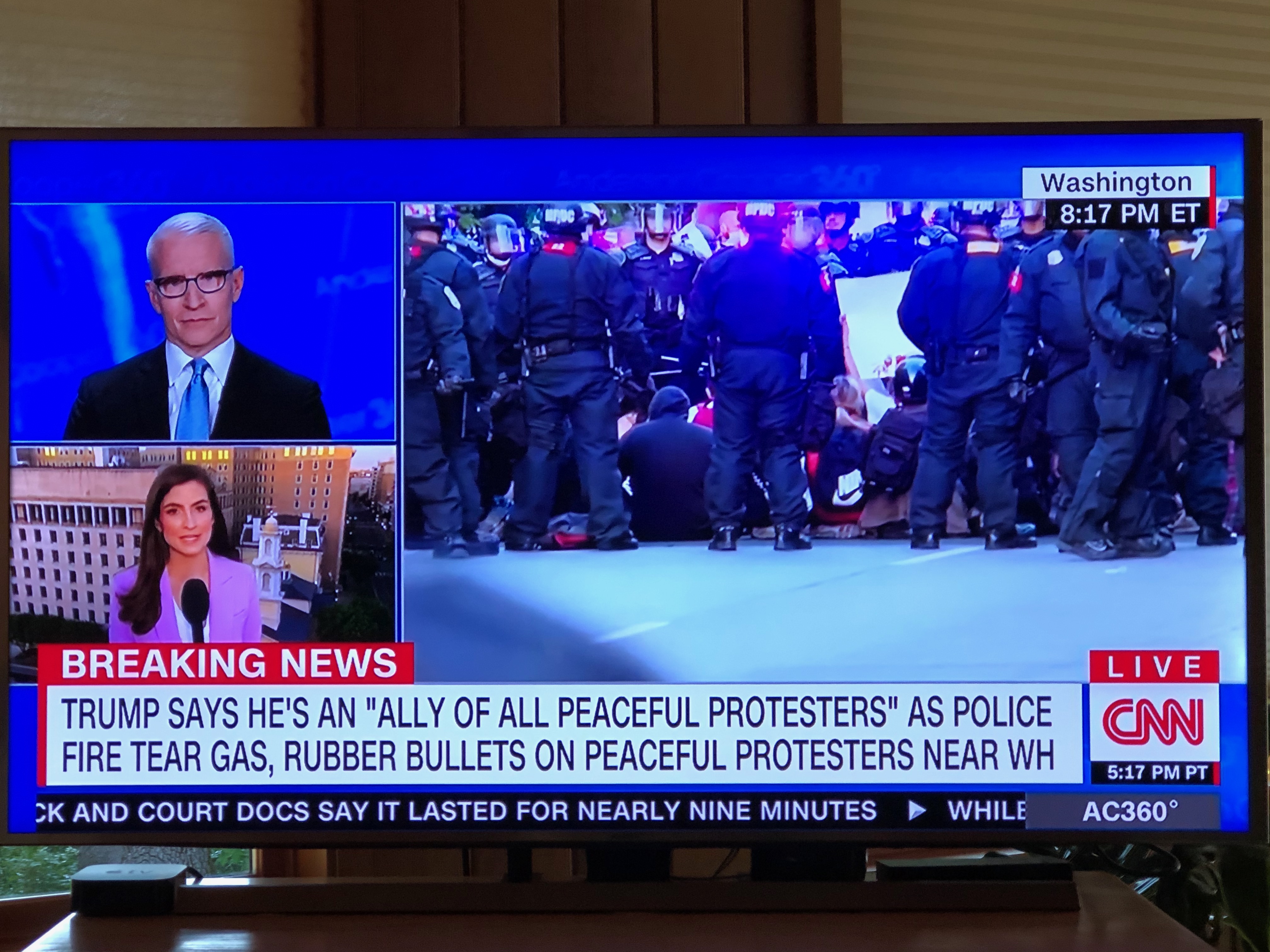 When I got home, I turned on the TV to learn what CNN was saying now — after federal authorities cleared out the peaceful protesters with tear gas, rubber bullets, and flash-bang explosives half an hour before a Washington D.C. curfew was to go into effect.