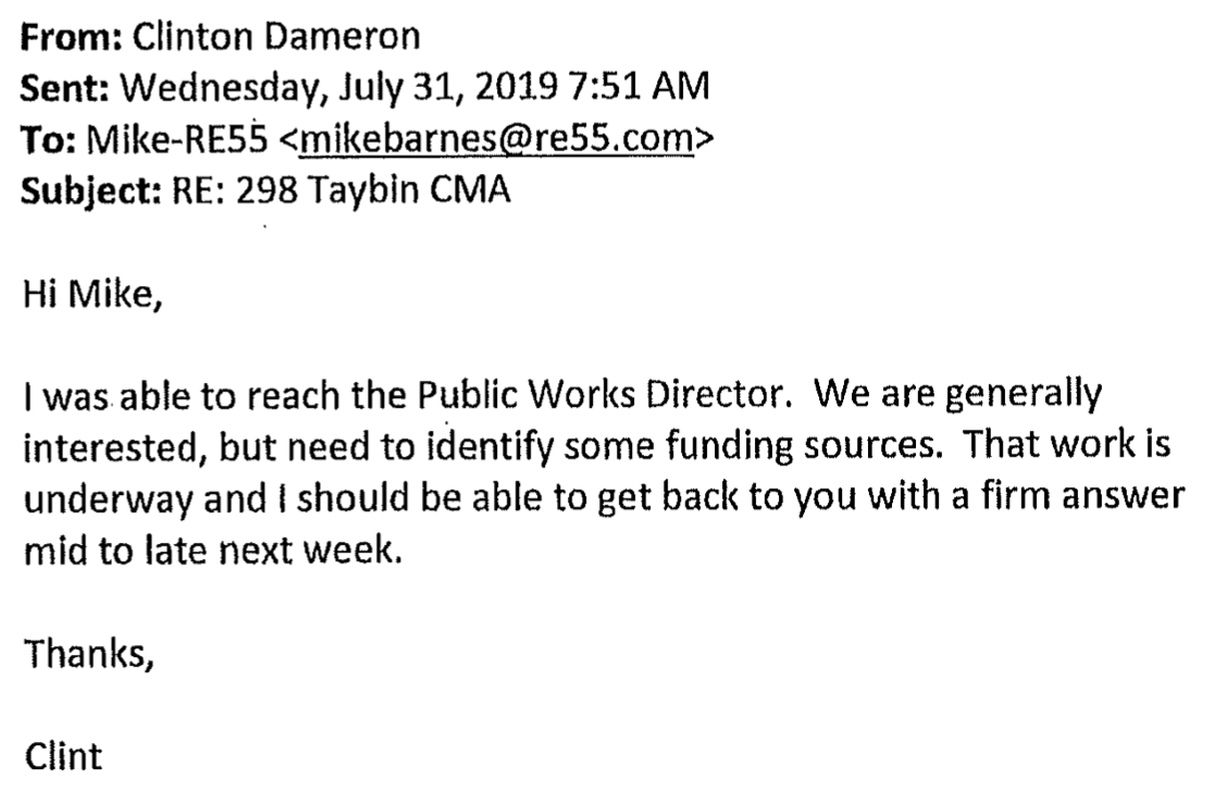 Five weeks later, Dameron tells the realtor that the City Council has given the go-ahead to move forward.
