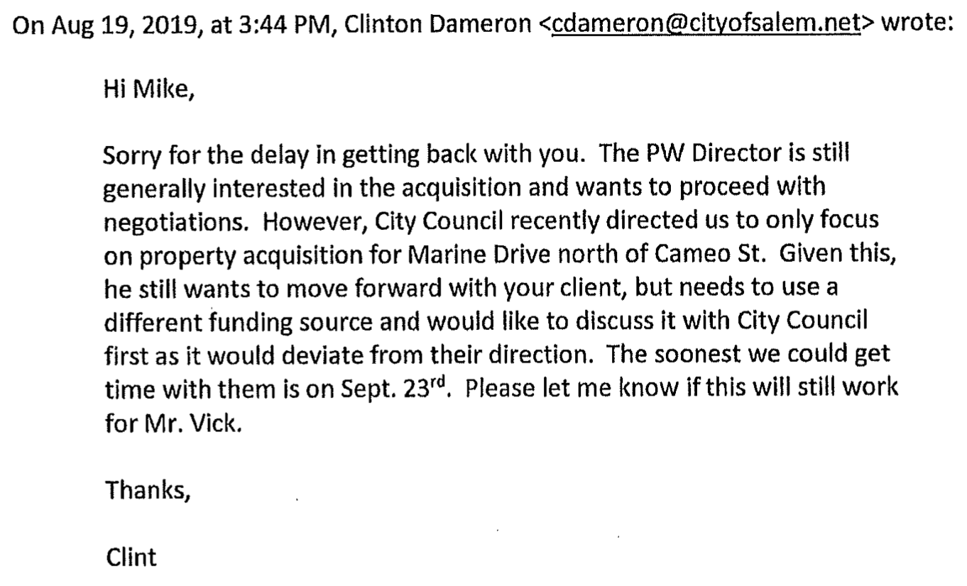Now, we get into some City of Salem staff machinations. On June 10, 2019 the City Council had limited purchases of Marine Drive right-of-way to the area north of Cameo Street. Taybin Road was south of Cameo. Oops. What to do?