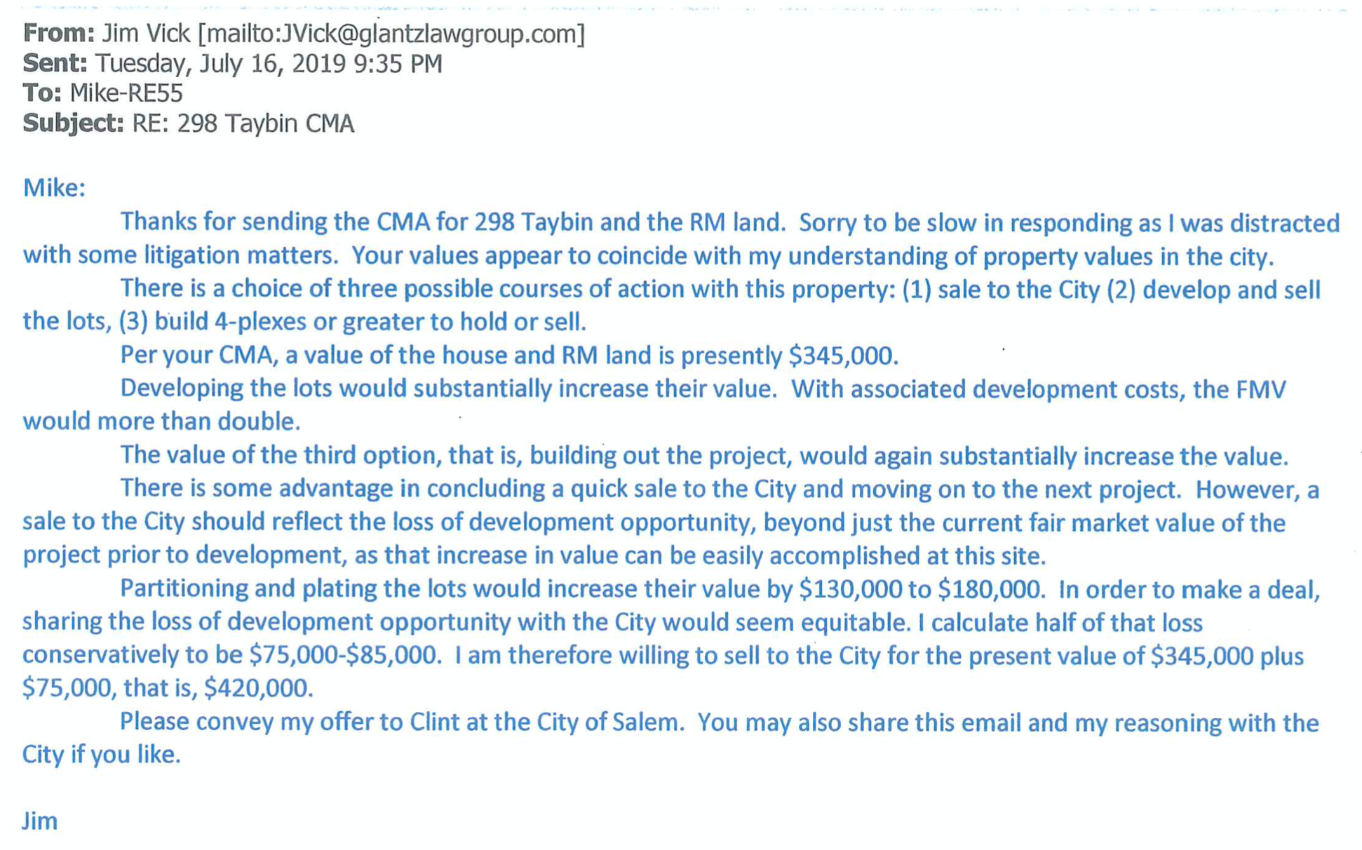 Jim Vick, the new owner, responded by saying that he could substantially increase the value of the property, which included a large acre lot, by developing smaller lots and/or by building 4-plexes or greater to hold or sell. So even though he'd owned the Taybin Road property for just a few months, he wanted $420,000 for it. Again, Vick had paid about $200,000 for it.