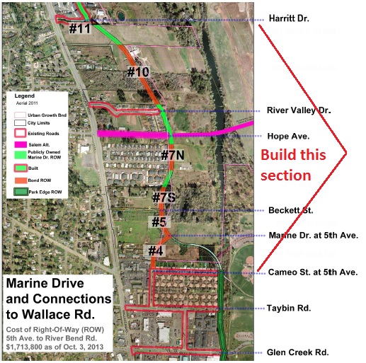 As background, below is an image showing the portion of Marine Drive that the West Salem Neighborhood Association wanted to have built, according to a 2017 Salem Breakfast on Bikes post. That post shared their position.