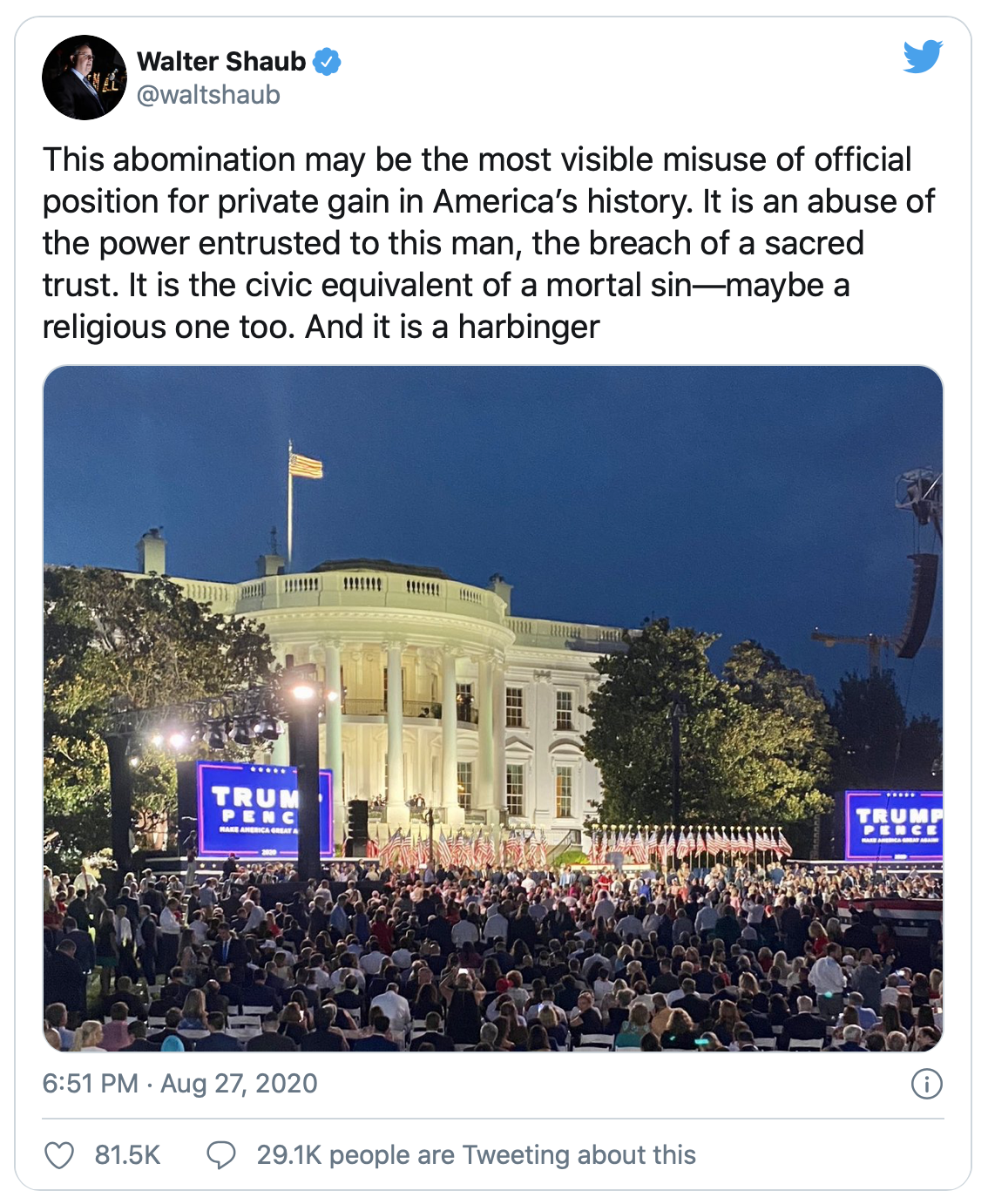Being 71, and interested in politics for almost my entire life, I've seen countless photos of the White House. This is the first time it has ever been used as a backdrop for a blatant political event.