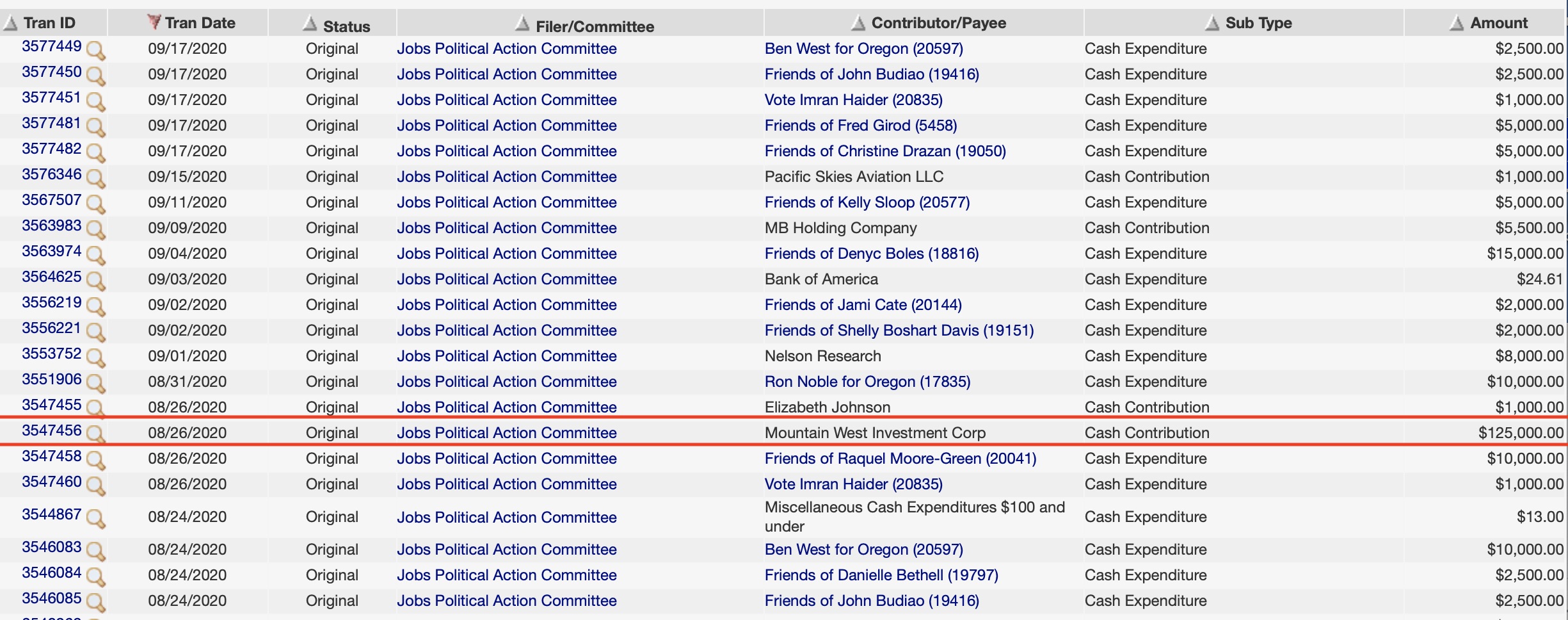Here's a screenshot of part of the most recent Secretary of State's transaction report for the Jobs PAC. I indicated the Mountain West Investment Corporation contribution in red.