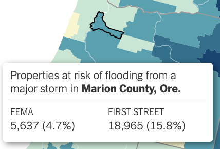 Another New York Times story is called "New Data Reveals Hidden Flood Risk Across America." Here's a screenshot for Marion County. It shows the difference between outdated FEMA estimates and more accurate maps from the First Street Foundation.