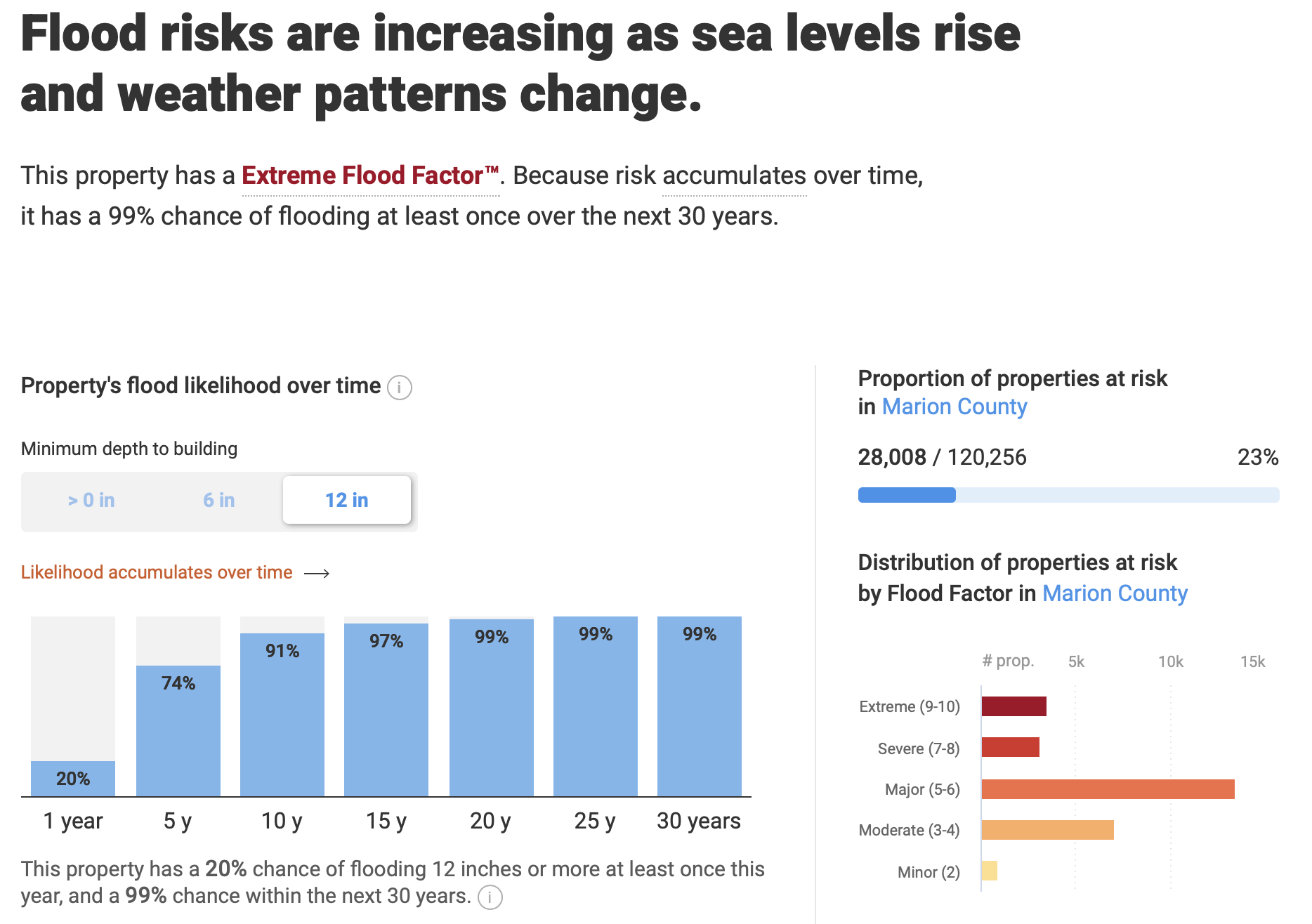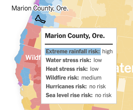 I took a look at some background information Meisner shared with me. A New York Times opinion piece shows the greatest risk from climate change faced by different parts of the country. Here's a screenshot for Marion County. The greatest risk is extreme rainfall.