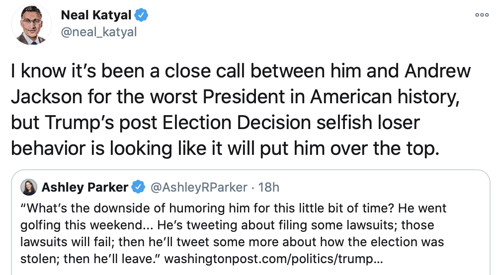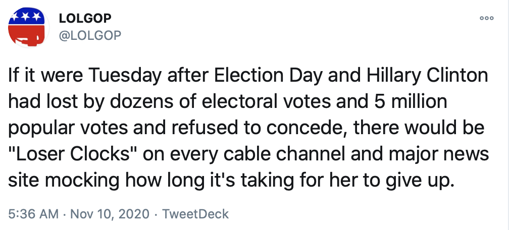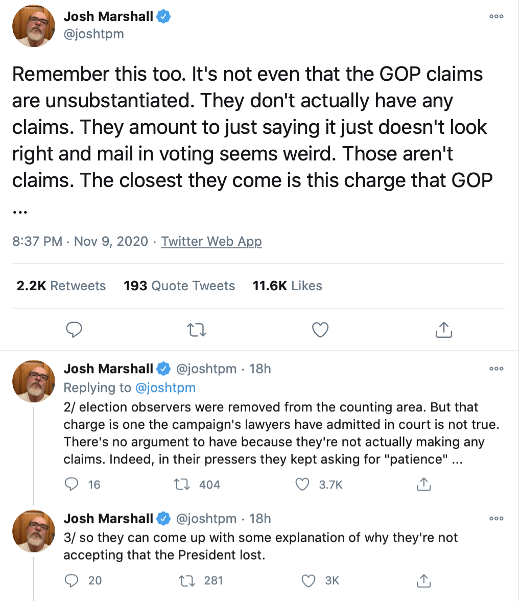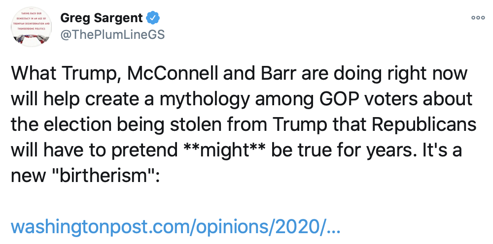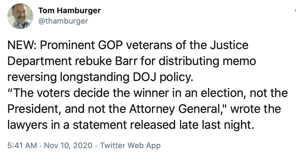 A November 10 Daily Beast piece, "Team Trump Shits on Barr's Bogus Voter-Fraud Crusade," also was encouraging.