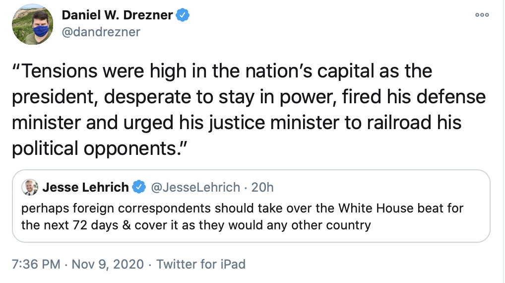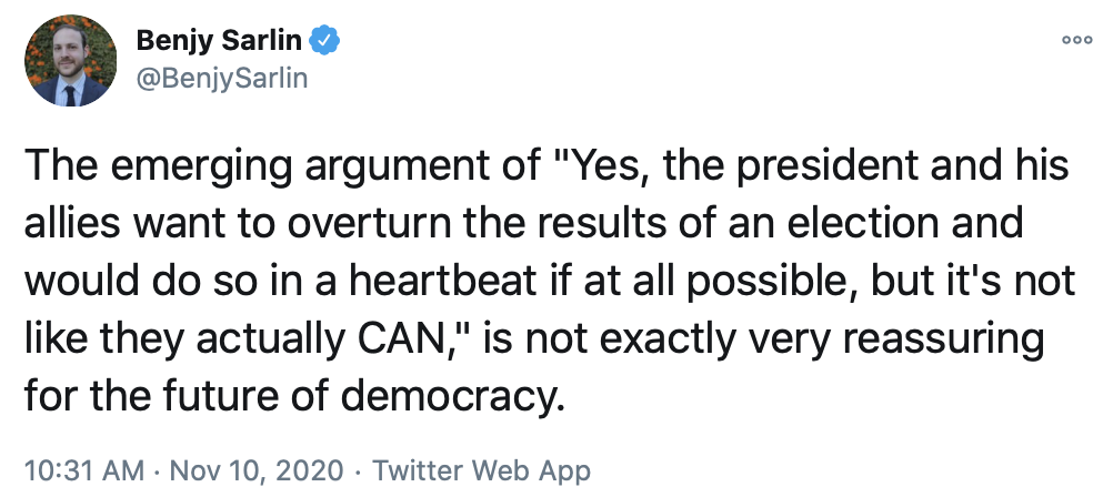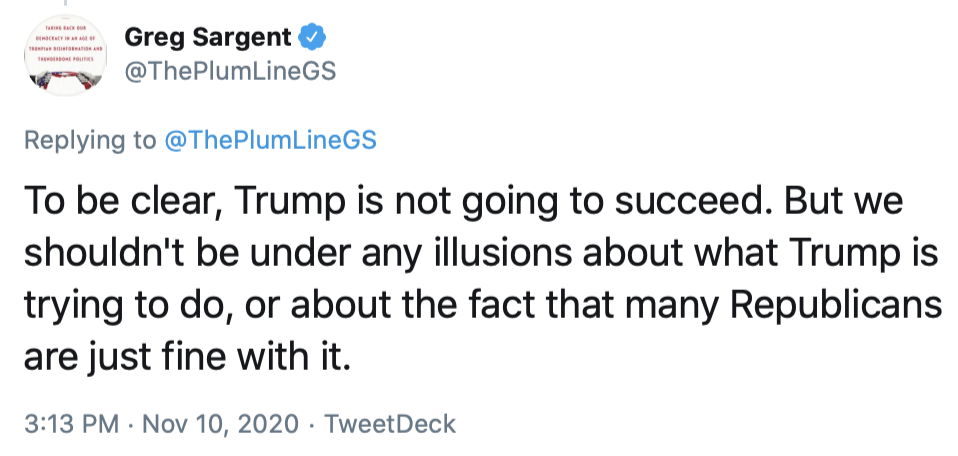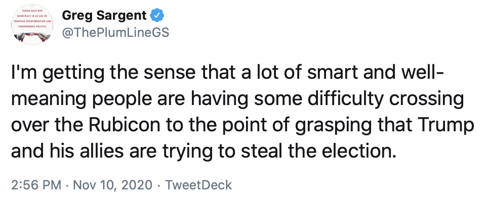 More worrisome is a November 7 Vox piece by Ezra Klein, "Trump is attempting a coup in plain sight."