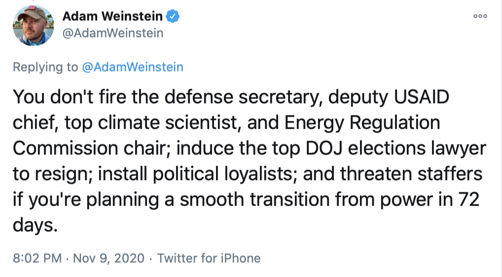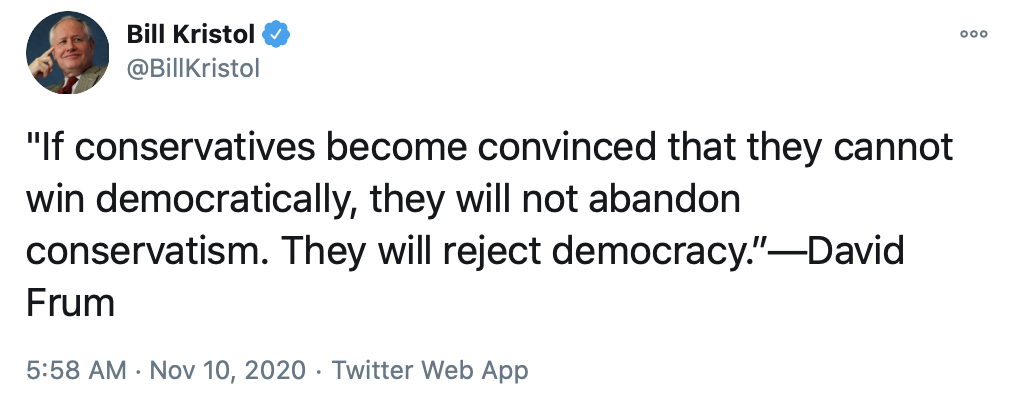 …His personal need to live in a perpetual fantasyland, a world where he is always winning, is so overpowering that he will do anything to maintain it. In his narcissistic drive to create this alternative reality, he will deepen divisions, spread paranoia, and render his supporters even more fearful of their fellow citizens and distrustful of their institutions. This is a president who never had America’s interests at heart. Do not expect loss to change him.