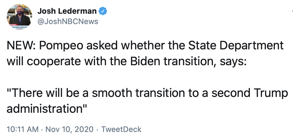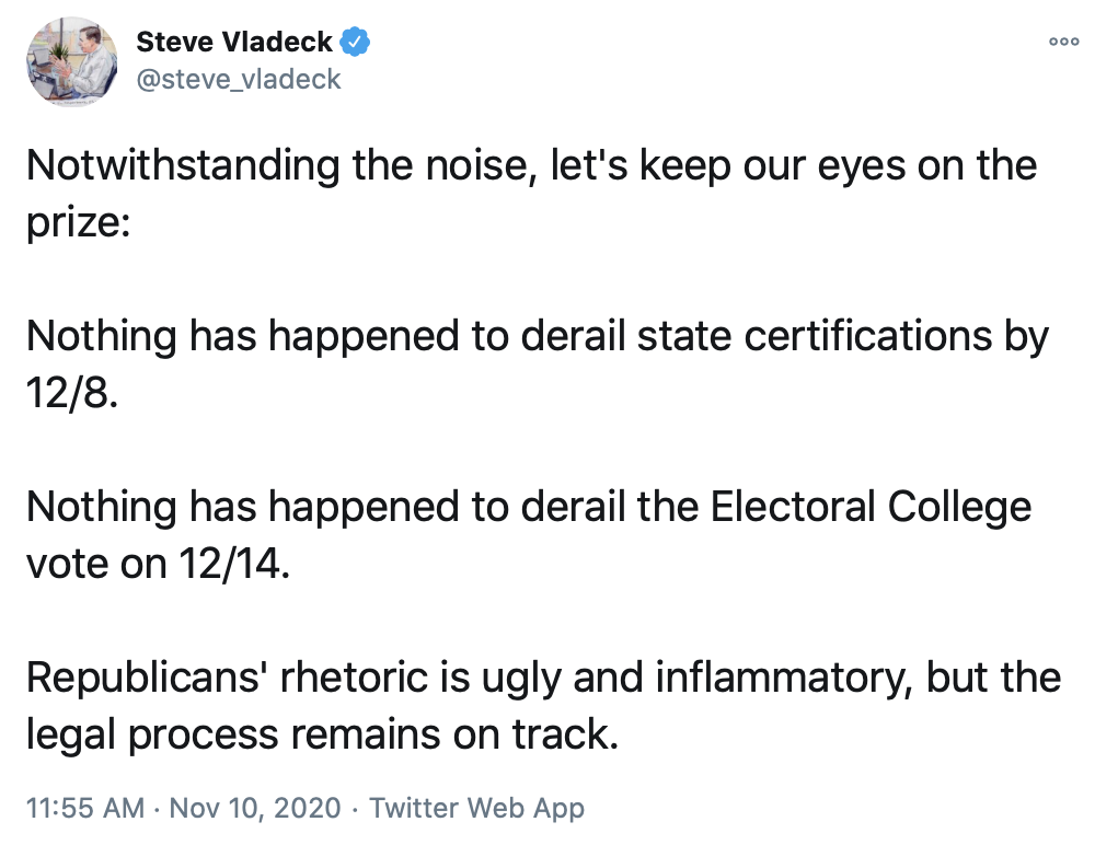 At this point, notwithstanding the relatively strong support Trump’s refusal to concede has gained from Republicans (especially those aspiring to succeed him as the party’s presidential nominee), there’s little prospect of any legal gambit that could keep the outcome in doubt sufficiently to support an outright election theft. In particular, the specter of Republican state legislators in states like Pennsylvania taking the appointment of presidential electors into their own hands if the results were being credibly contested hasn’t materialized at all.