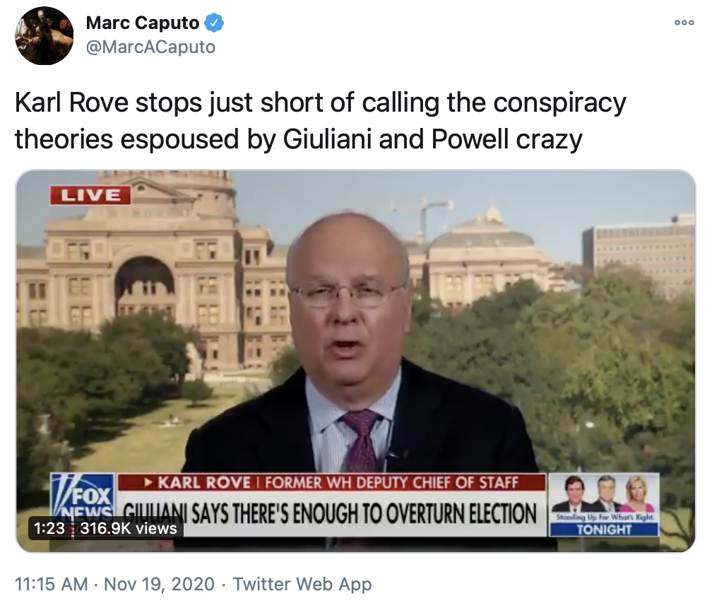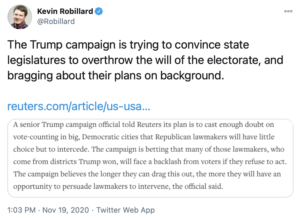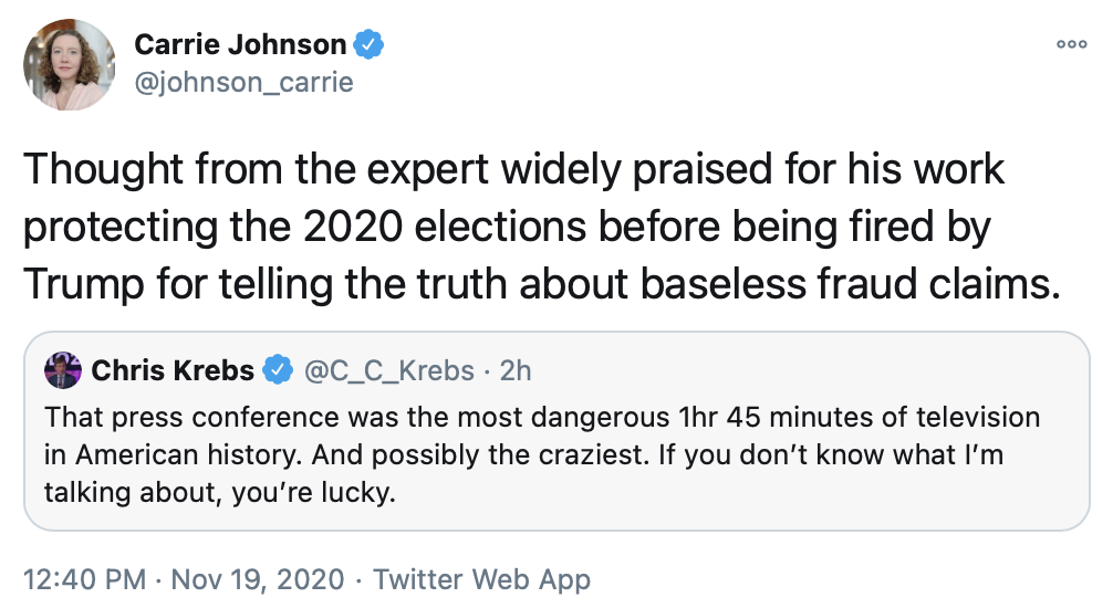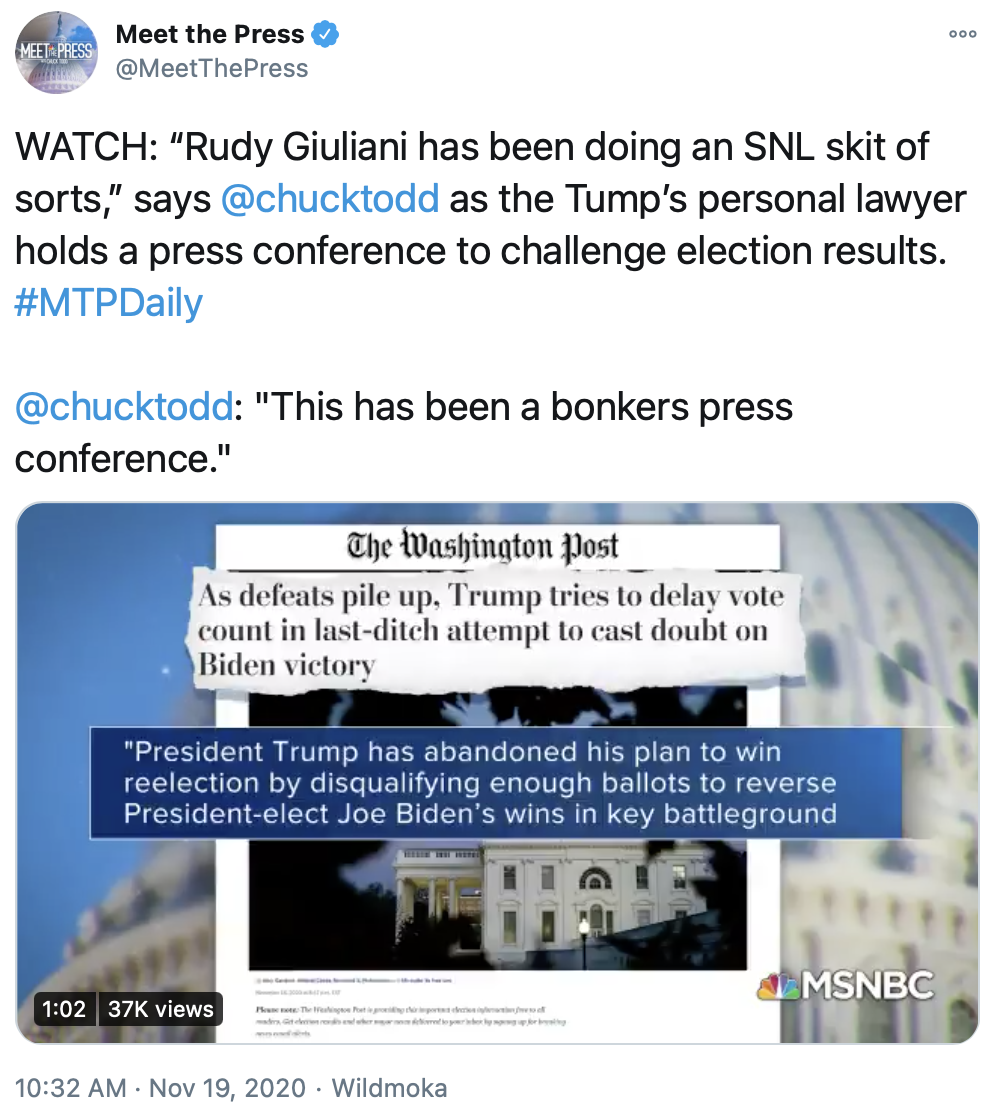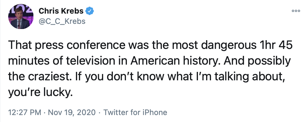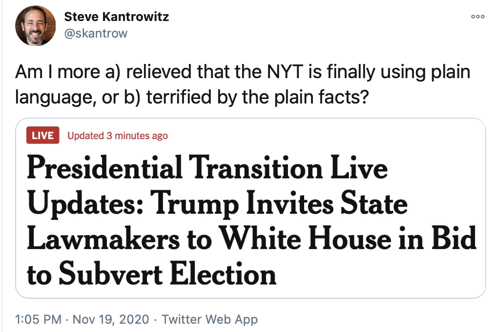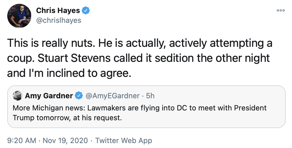 Mostly through my Twitter feed, I've been watching today's seditious actions by Trump, Rudy Giuliani, and the wacko lawyers helping Trump and Giuliani try to steal the election. Here's a bunch of tweets that reveal what's going on. The tweets go from less recent to more recent.