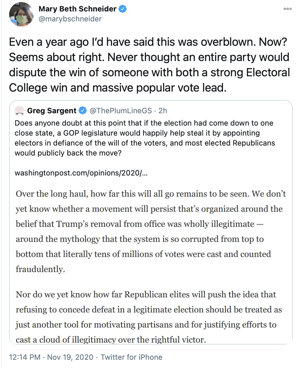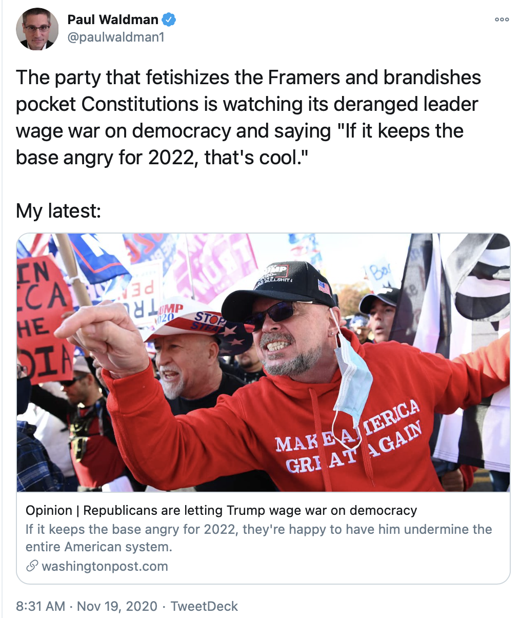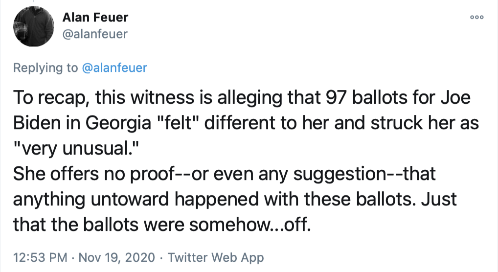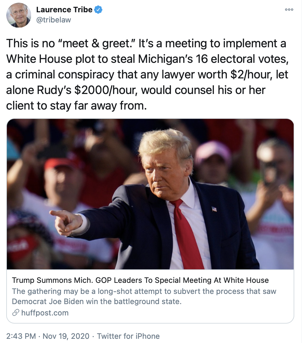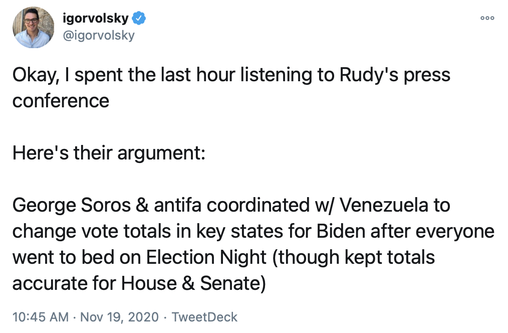 Mostly through my Twitter feed, I've been watching today's seditious actions by Trump, Rudy Giuliani, and the wacko lawyers helping Trump and Giuliani try to steal the election. Here's a bunch of tweets that reveal what's going on. The tweets go from less recent to more recent.