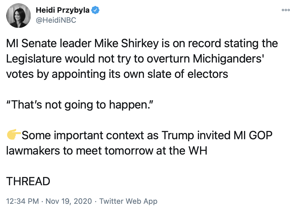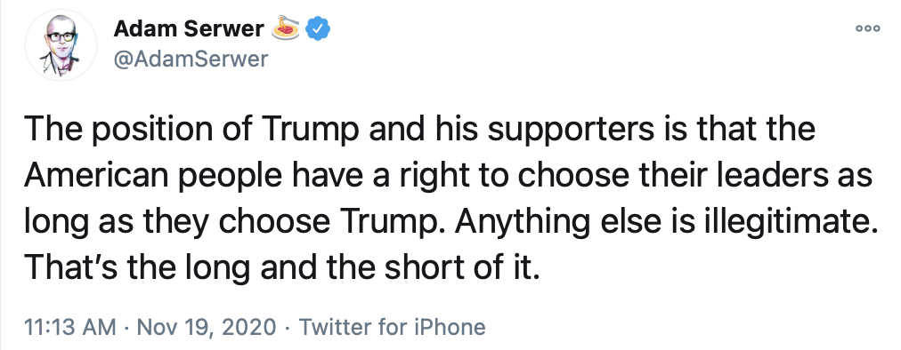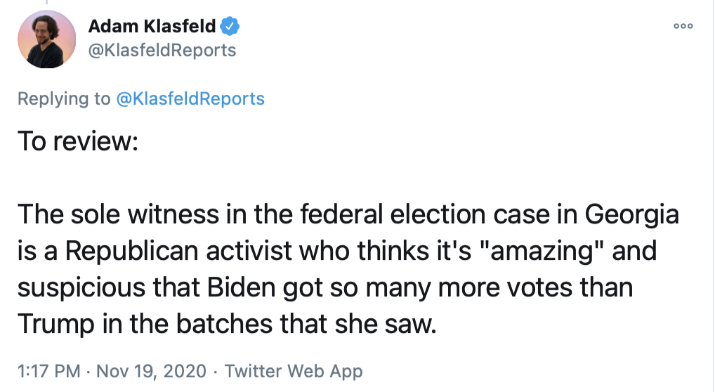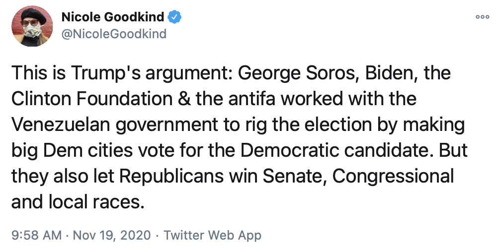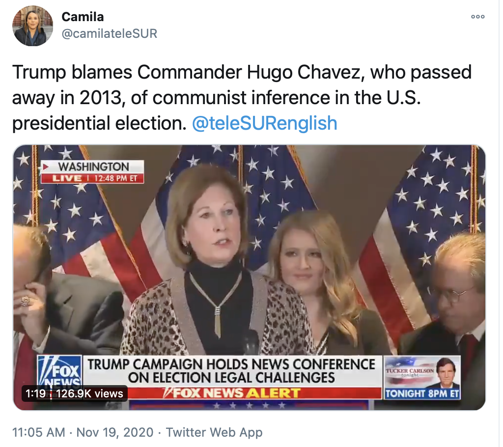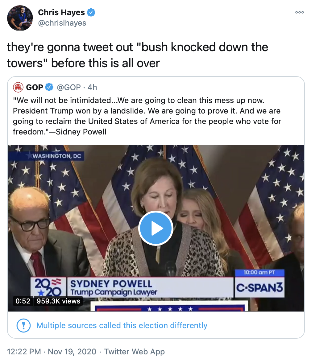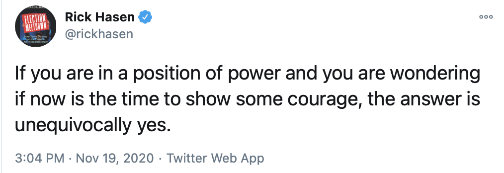 Mostly through my Twitter feed, I've been watching today's seditious actions by Trump, Rudy Giuliani, and the wacko lawyers helping Trump and Giuliani try to steal the election. Here's a bunch of tweets that reveal what's going on. The tweets go from less recent to more recent.