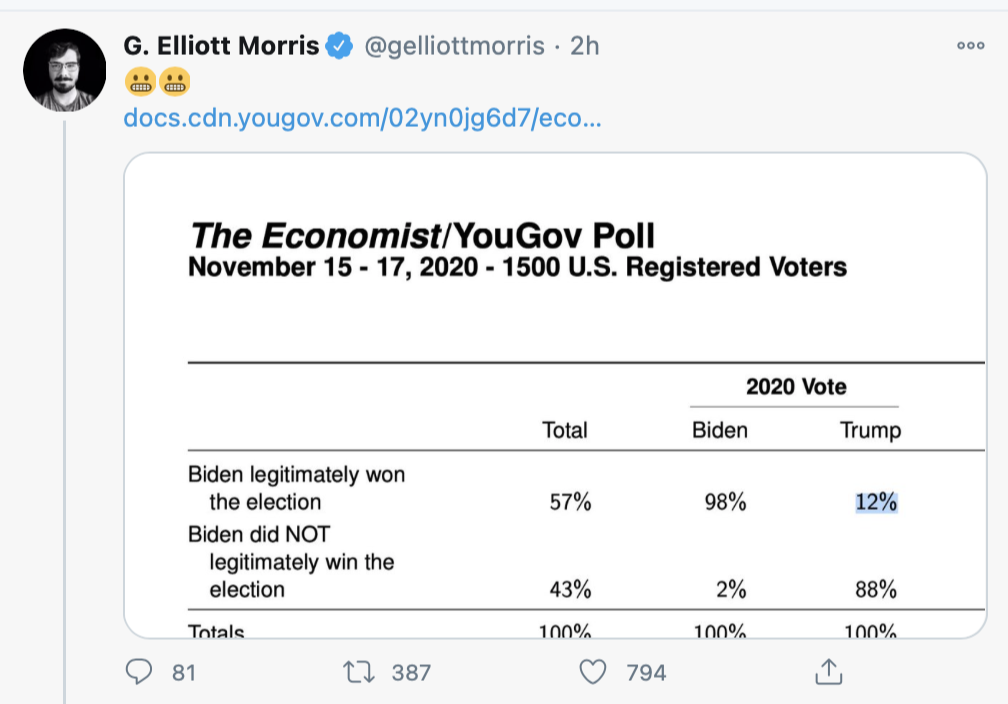 Wow. This poll shows only 12% of Trump voters believing that Biden legitimately won the election. That's scary. If you talk to people who voted for Trump, about nine out of ten have bought into the baseless conspiracy theory that Biden didn't win fairly.