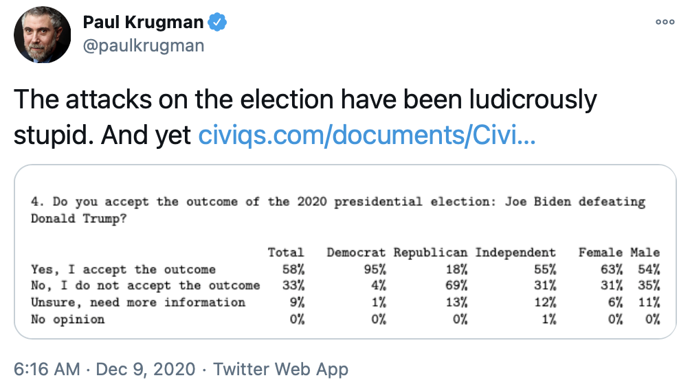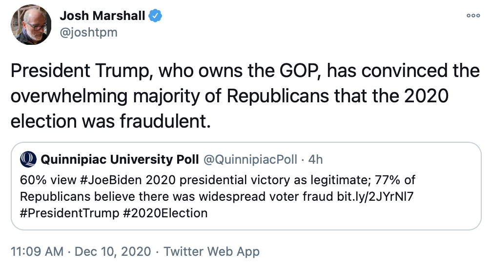 The first tweet below shows a poll where 69% of Republicans said they didn't accept that Joe Biden beat Donald Trump. That's insane, since there is zero evidence of widespread election fraud, and only a few scattered cases of any sort of fraud. (To my knowledge those all involved Republicans, by the way.)