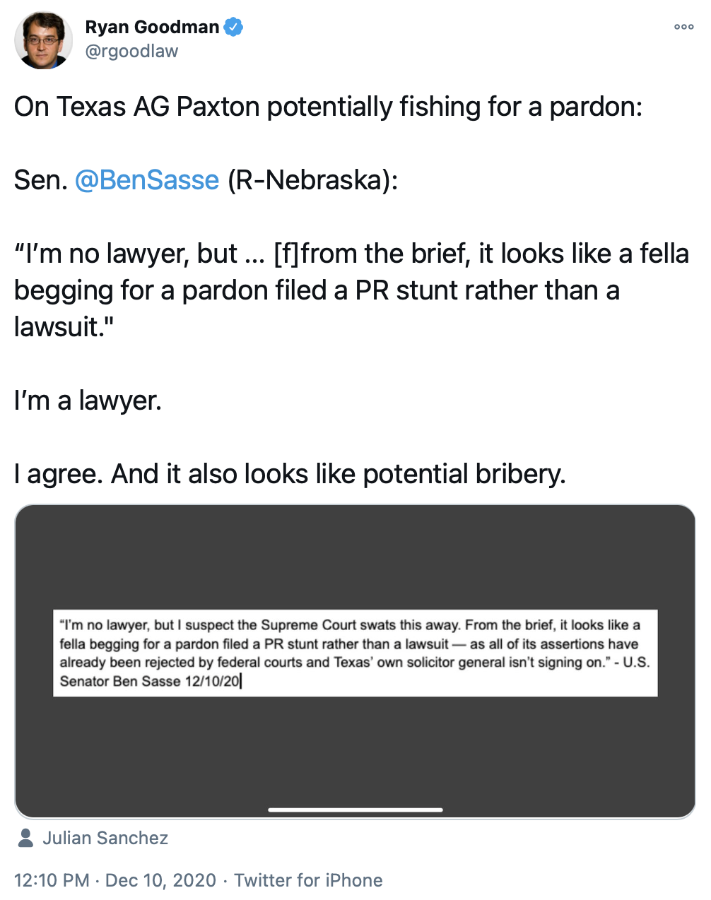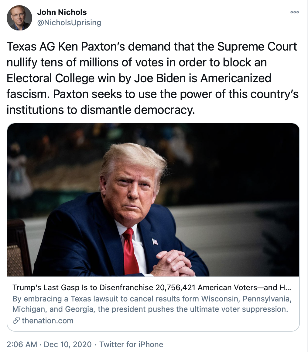 But the bad news is that — as shown in the tweets below — attorneys general in 17 other states are supporting Texas in what amounts to an authoritarian coup attempt which, were it to somehow succeed, would destroy American democracy by giving Trump a second term that he didn't deserve.