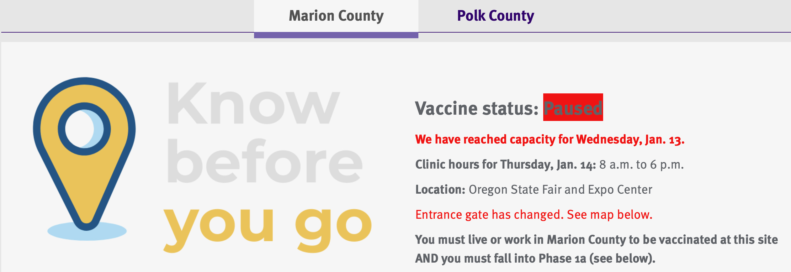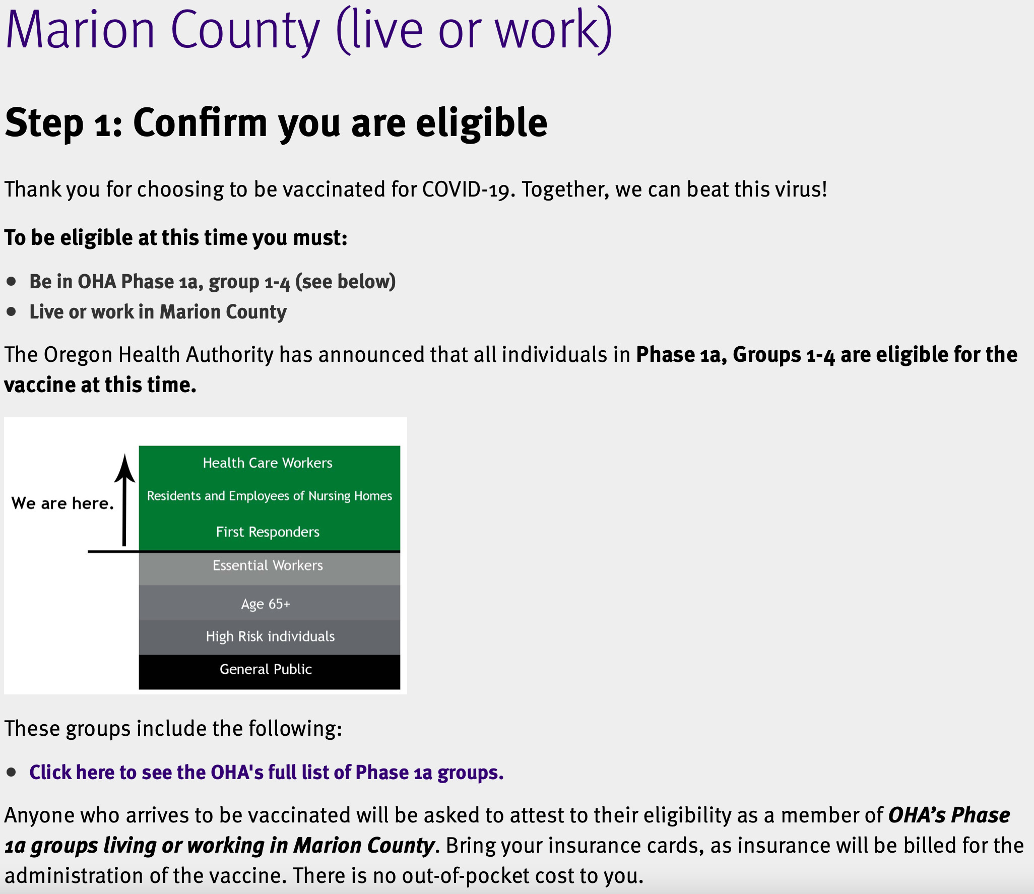 So anyone who went to the Salem Health Covid Vaccine web page would be met with the words: "You must live or work in Marion County to be vaccinated at this site AND you must fall into Phase 1a (see below)."