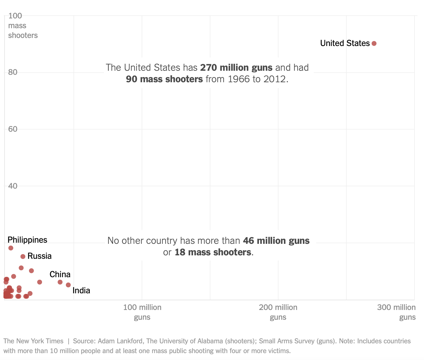 A 2017 New York Times story tallied up the mass shooting death toll in various countries from 1966 to 2012.