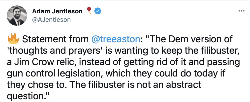 That's a good start, though Biden also needs to take a strong stand on doing away with the Senate filibuster if he wants any gun control legislation to get through Congress and arrive on his desk for signing.