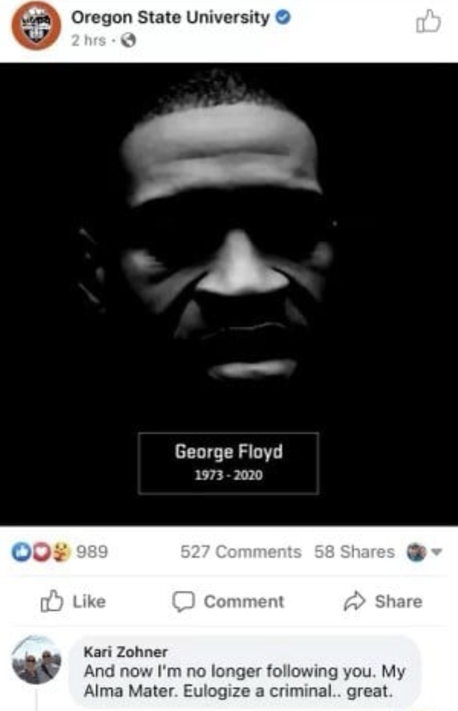 In comments, since deleted, made on an Oregon State University Facebook post April 20, 2021, Candidate for School Board Zone 1, Kari Zohner, remarked “And now I’m no longer following you. My Alma Mater. Eulogize a criminal..great.” Candidate Zohner then proceeded to reply to individuals responding to her remarks by belittling them, such as a reply to an educator with the remark, “ah.. an educator. Shocking that you have such an eloquent stance.”