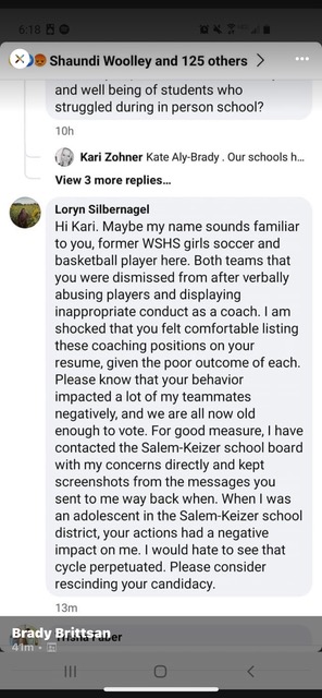 UPDATE: Just got this screenshot of a Facebook comment from a former West Salem High School student who has some serious accusations about bad behavior from Zohner when she was a coach at the school. The student also asks Zohner to give up on running for the school board.