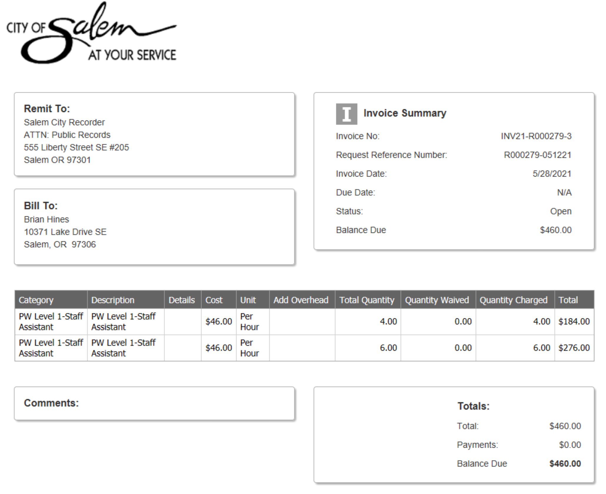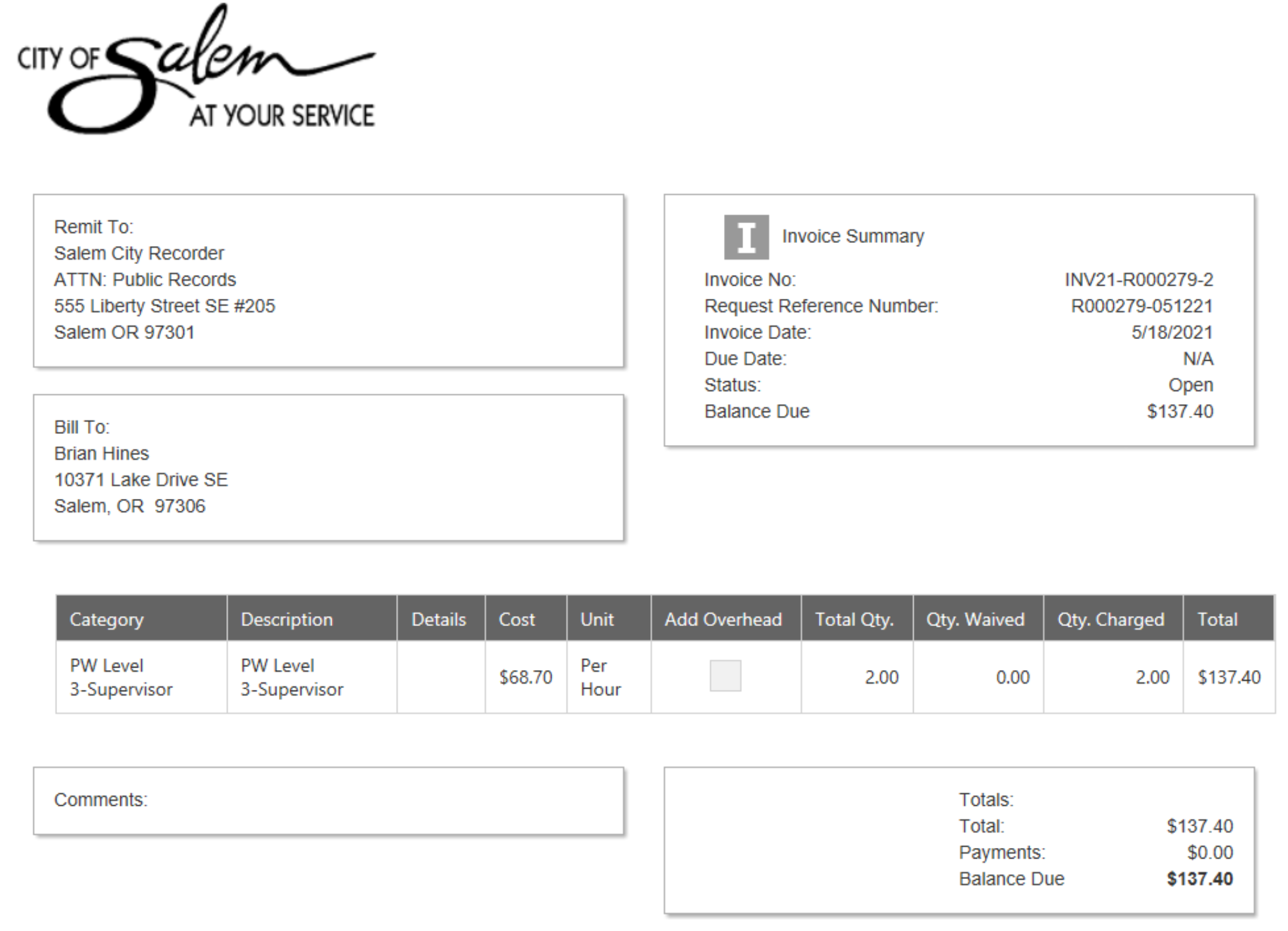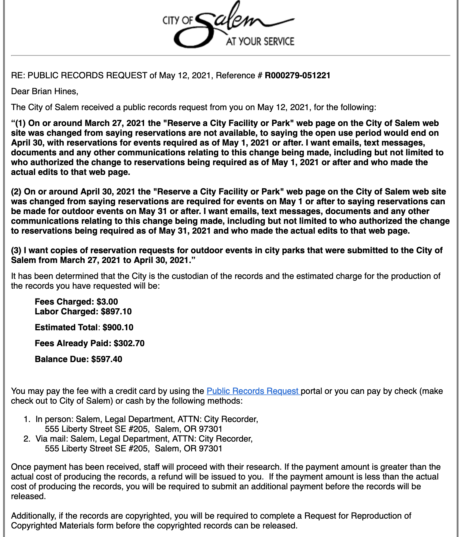 Read it and see if you think it's fair that a citizen activist like me should have to pay $900 to learn why, and how, two changes to a City of Salem parks reservation web page were made, along with getting copies of park reservation requests submitted between March 27 and April 30 of this year.