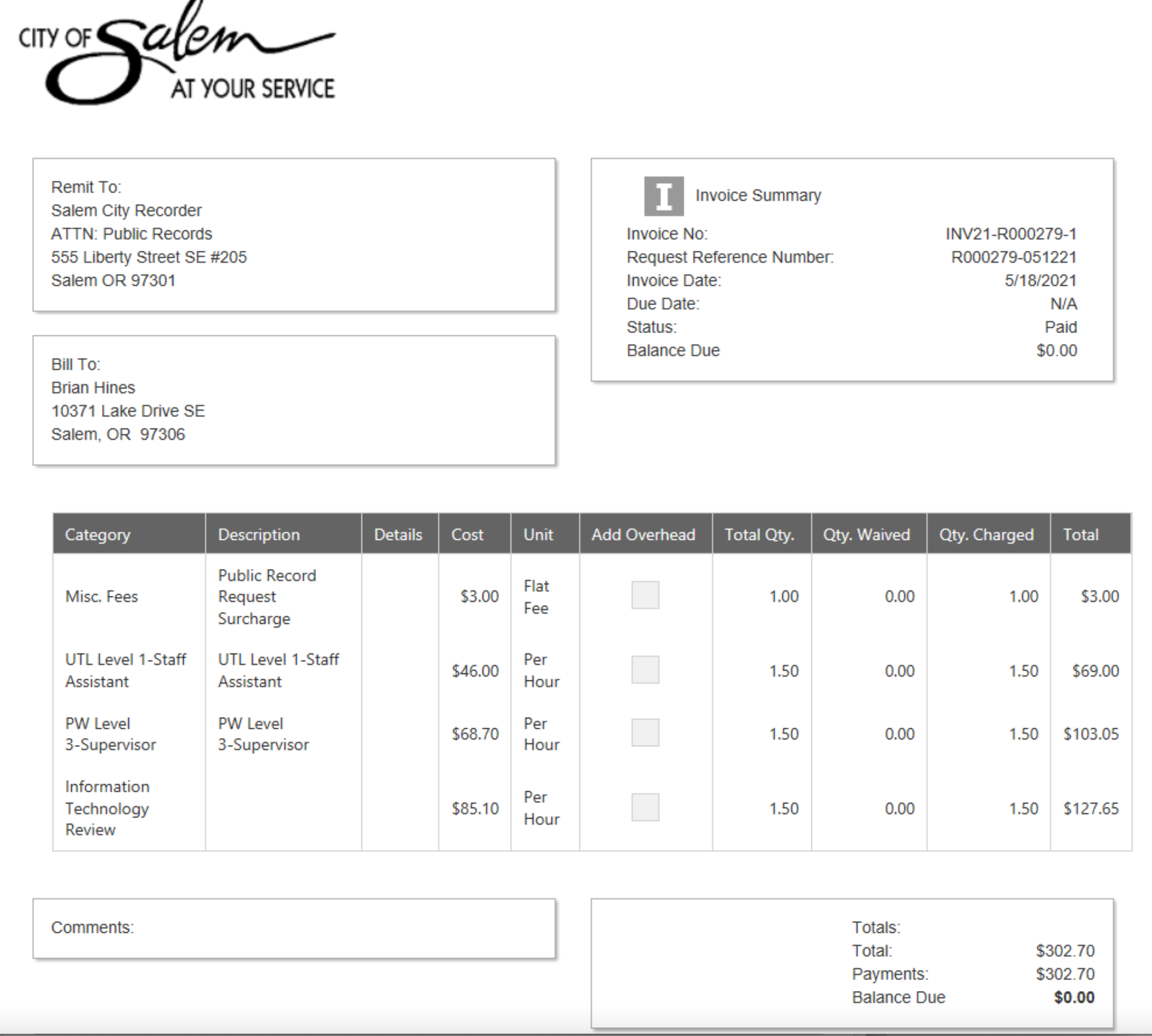 You can see that originally 4.5 hours of staff time was needed to fulfill my request. Now supposedly 16.5 hours of staff time are required. Something is wrong at the City of Salem. That's an absurd amount of time to fulfill a simple public records request.