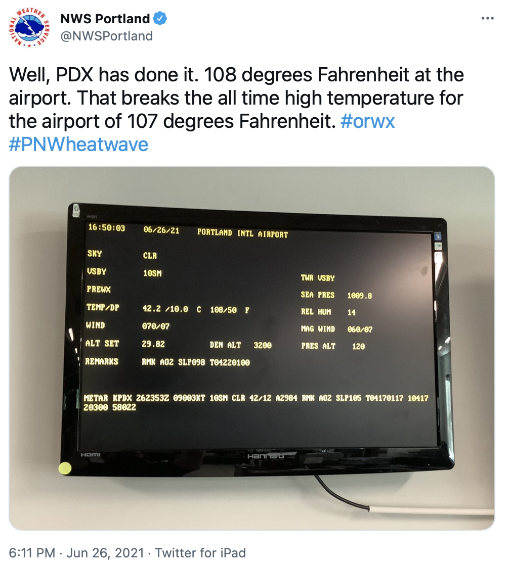 Today Portland broke the all-time record for a high temperature at the airport, 108 degrees.