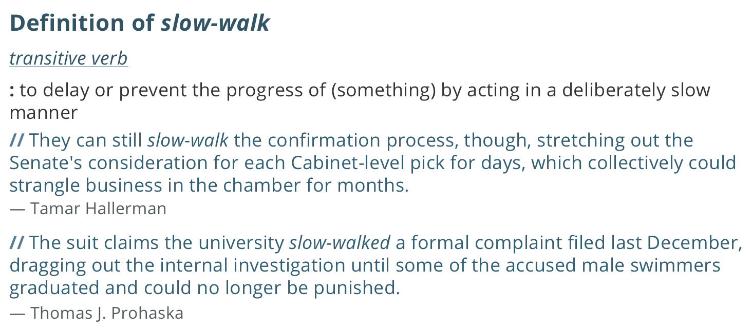But I do have considerable experience with city officials engaging in a different sort of slow-walking, defined as: