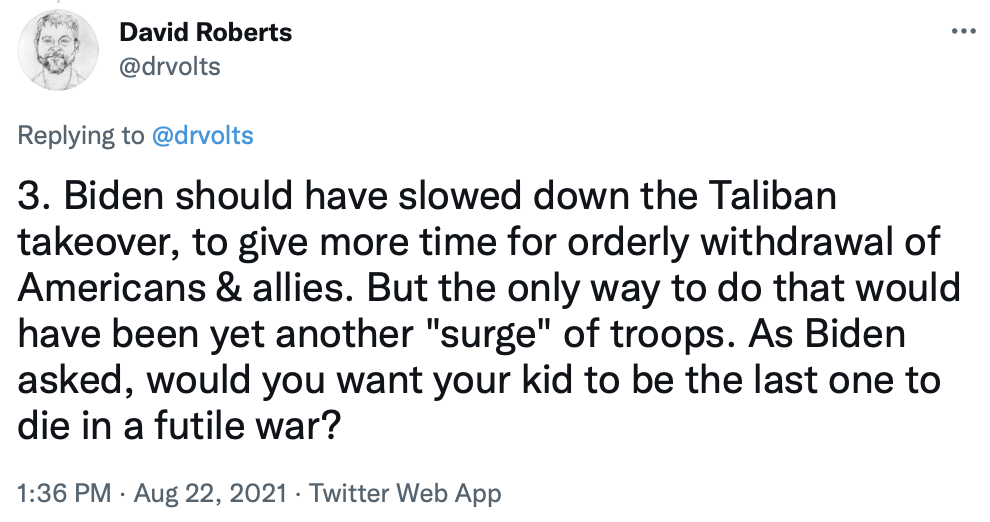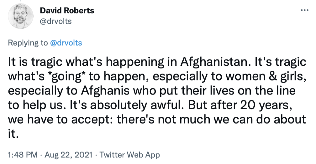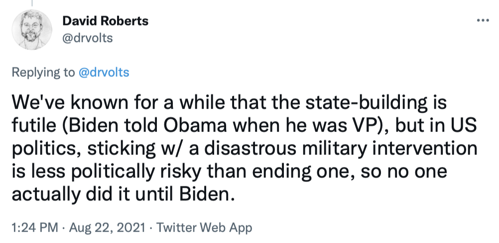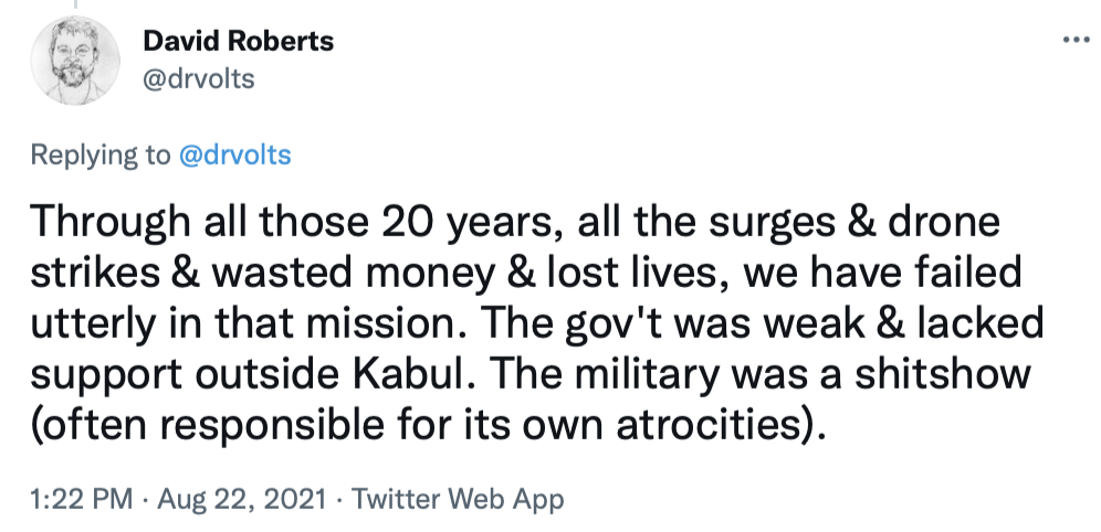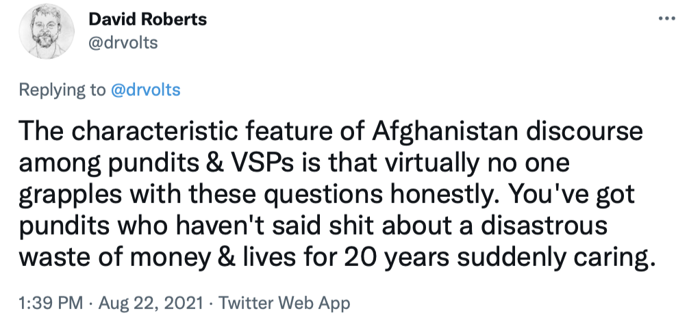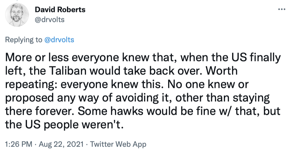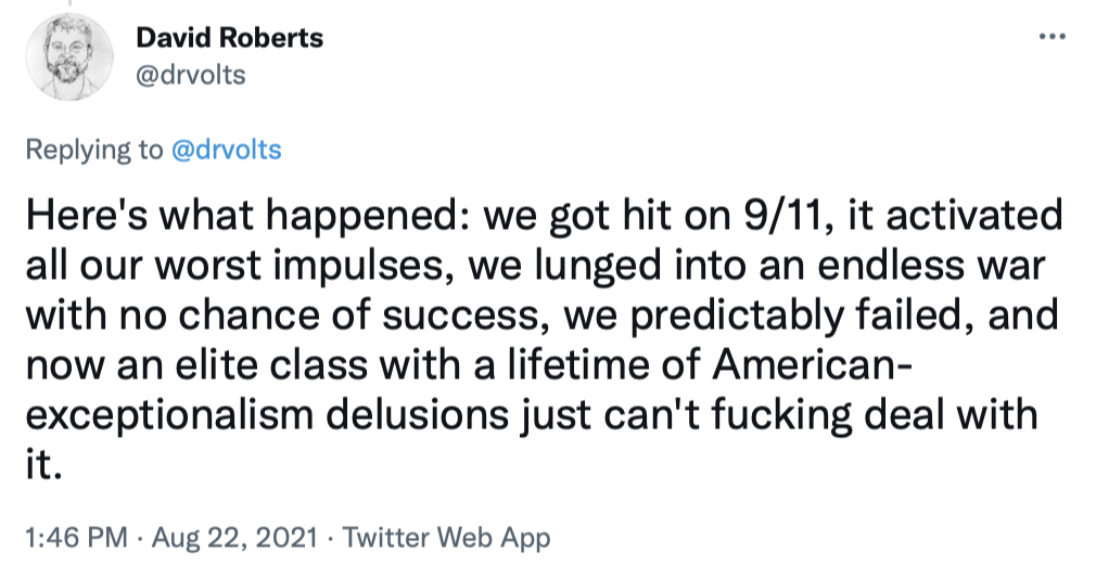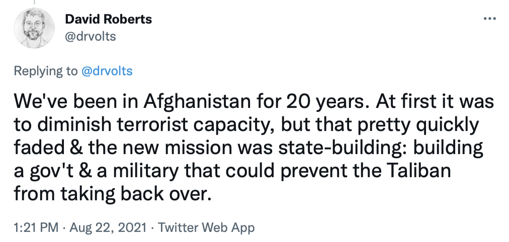 I'll end by copying in a series of tweets that do a great job of briefly explaining the Afghanistan war and the current uproar over the American pullout.