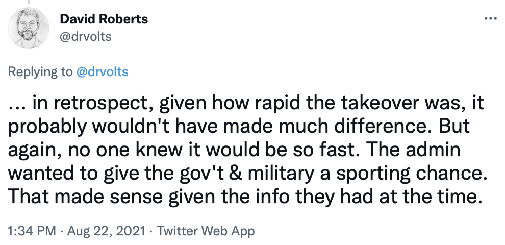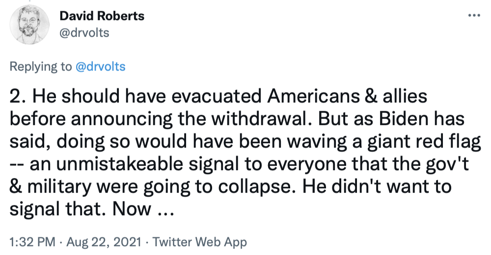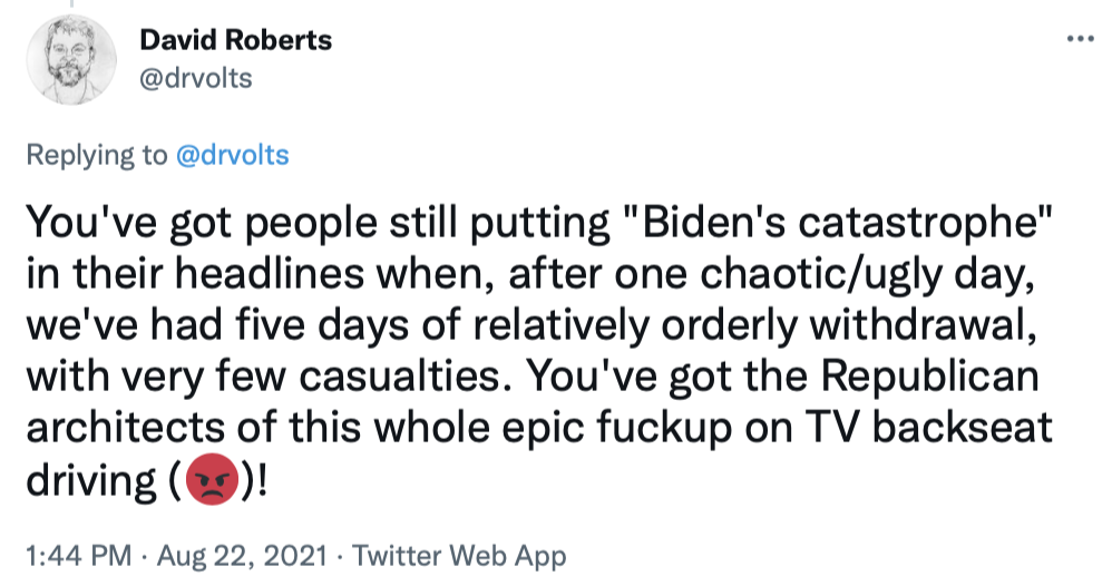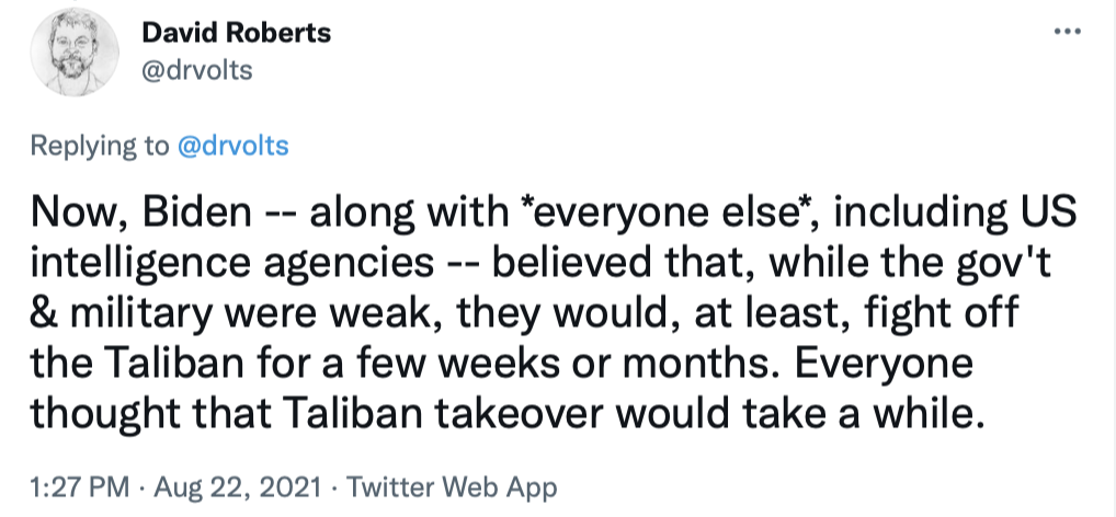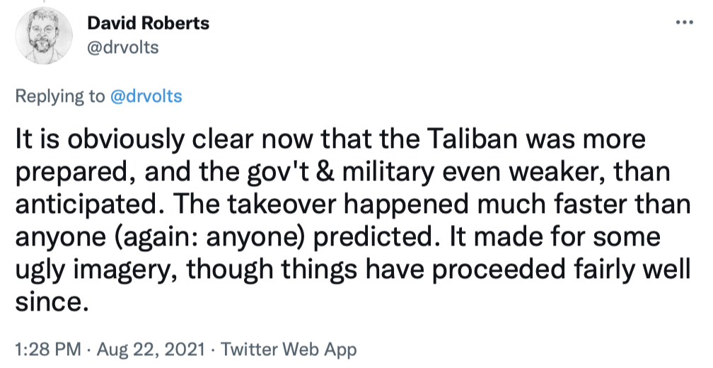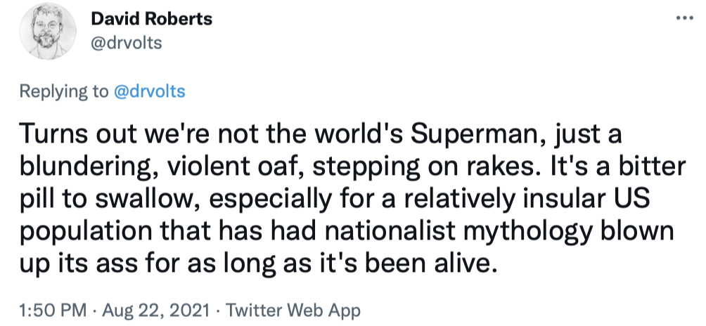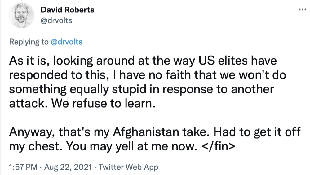 I'll end by copying in a series of tweets that do a great job of briefly explaining the Afghanistan war and the current uproar over the American pullout.
