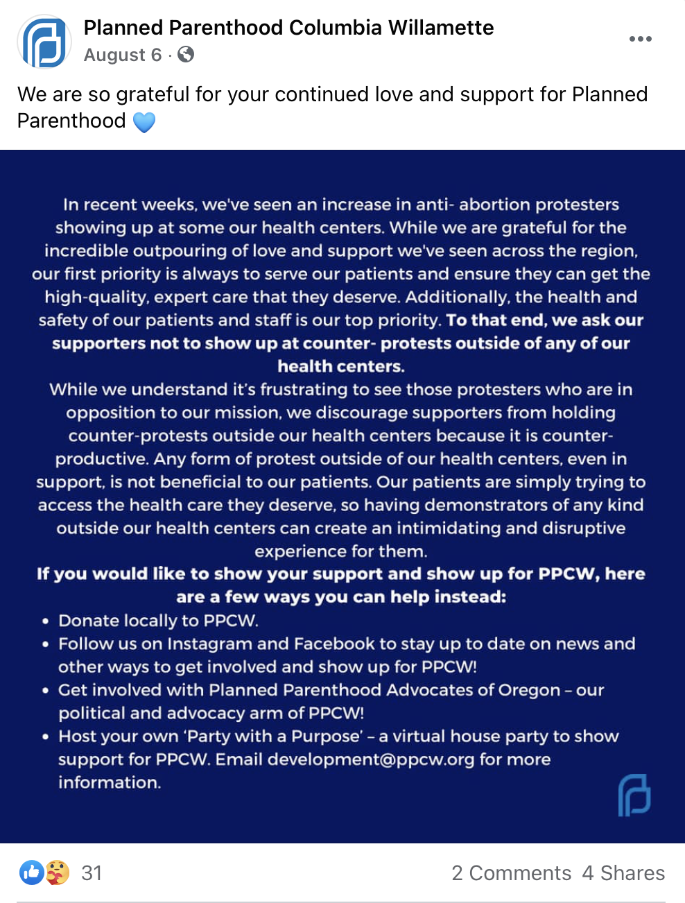 So hopefully people in Salem who want to support Planned Parenthood will do as Planned Parenthood asks and not engage in any additional protests or counter-protests at the local health center.