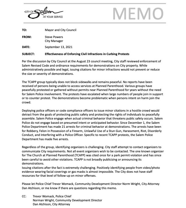 Salem City Manager Steve Powers spoke about this in a memo that was shared on Facebook today. Powers said: