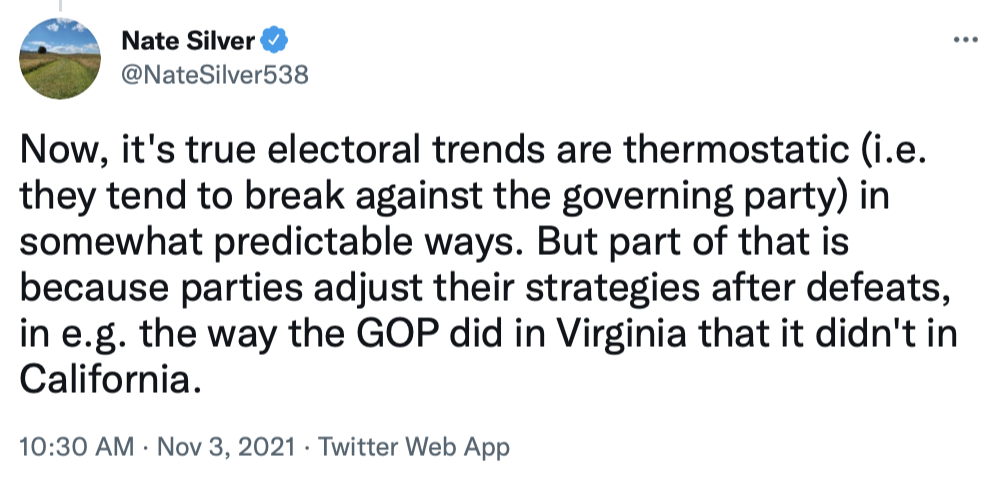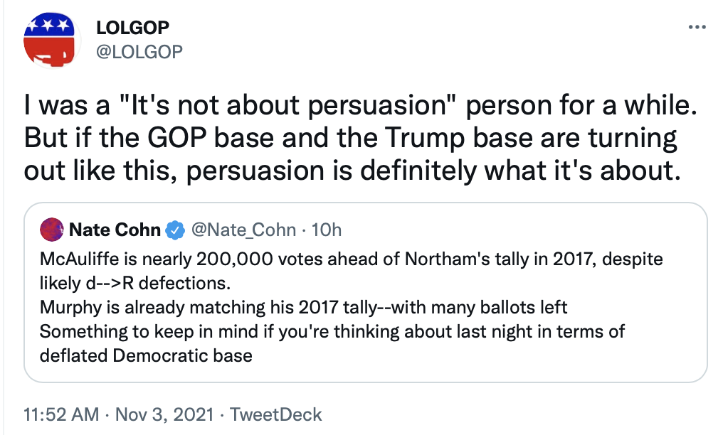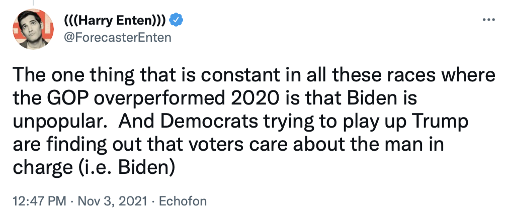 But wasn't the bad showing for Democrats in Virginia and New Jersey caused by a much larger turnout of passionate Trump supporters, compared to other voters, something that's much less likely to happen in the 2022 midterm election?