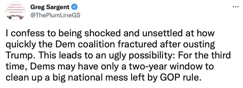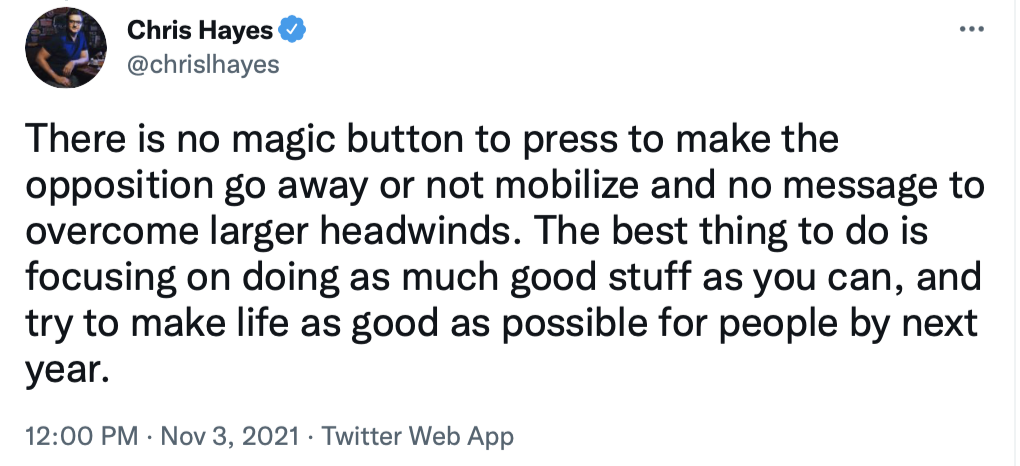 Given how poorly Democrats performed, the odds now are considerably higher that Republicans will be in control of one or both houses of Congress after the 2022 election. So Biden needs to pull out all the stops, including pressuring Manchin and Sinema to do away with the filibuster for voting rights bills.