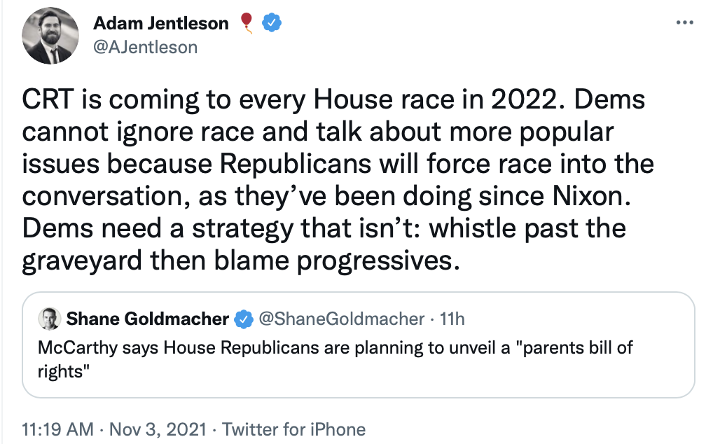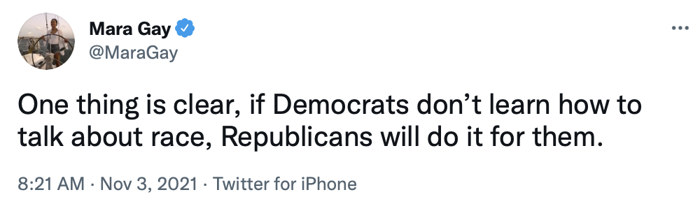 Race has to be handled more wisely by Democrats than decrying attacks on Critical Race Theory. Sure, that isn't taught in schools other than colleges.