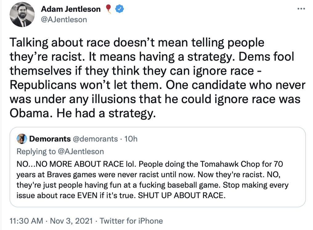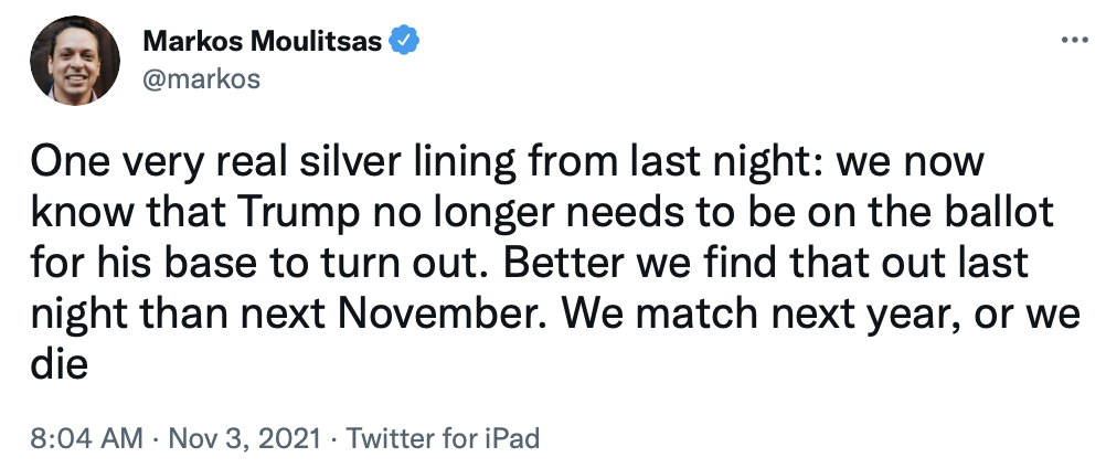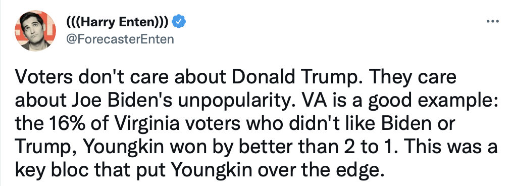 Regardless who the Democratic candidate is, it seems clear that their campaign can't be based on being opposed to Trump. That didn't work for McAuliffe in Virginia, though it was successful for Joe Biden when Trump was still president, still on Twitter, and still saying his usual crazy stuff.