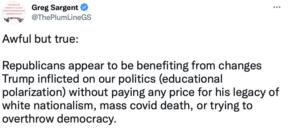 After going for Biden over Trump by ten points in 2020, Virginia elected the Republican candidate for Governor, Glenn Youngkin, by several points. He was endorsed by Trump, but avoided an overly close connection with Trump. And it looks like the GOP will recapture the Virginia House of Delegates