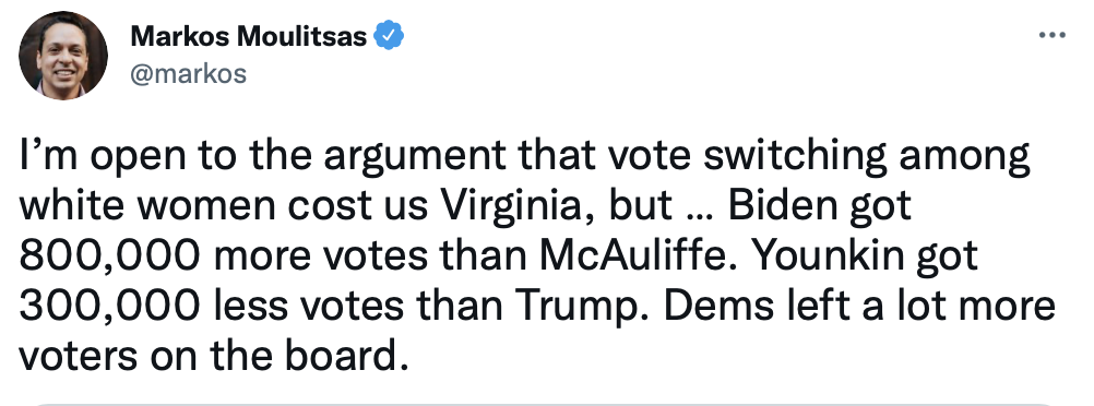 In Virginia at least, where there's been more analysis of yesterday's results, the problem for Democrats was that Republicans got a larger share of the vote across the board, including independent-leaning suburban voters who were a big part of Biden's victory in 2020.