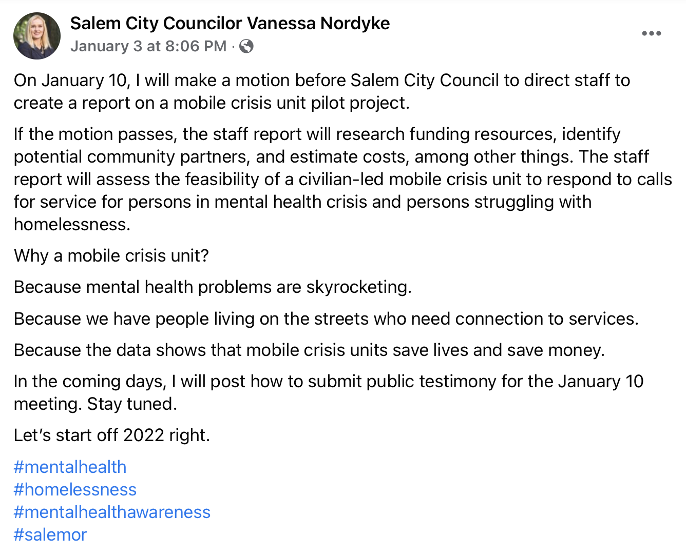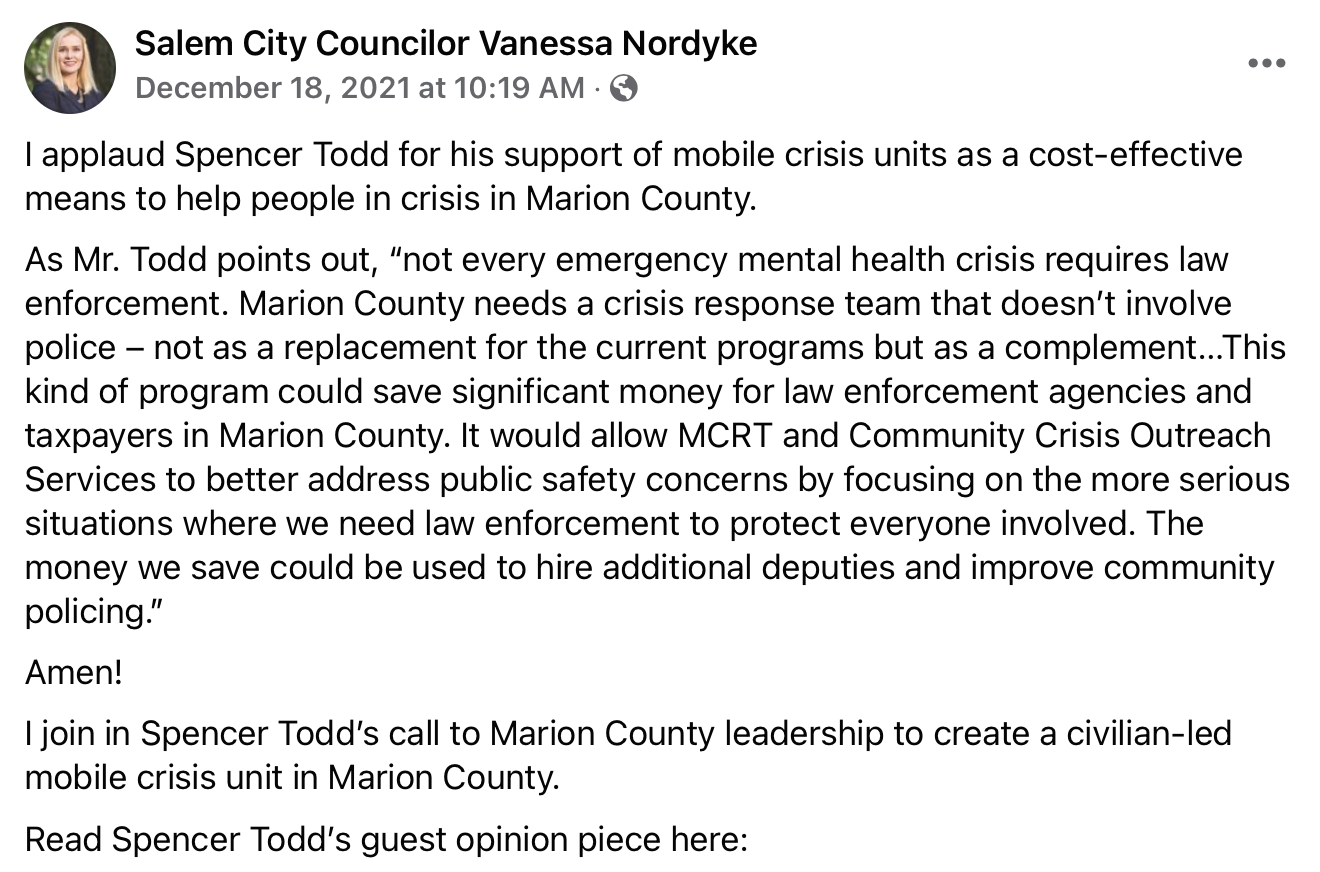 A few days ago Nordyke announced in a Facebook post that she wants City of Salem staff to prepare a report on the feasibility of a mobile crisis unit.
