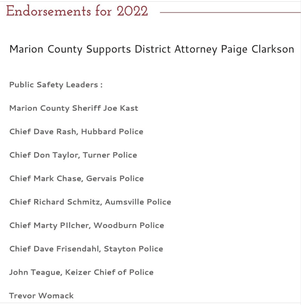 Another interesting wrinkle is that Trevor Womack has endorsed for re-election the incumbent Marion County District Attorney, Paige Clarkson, while Vanessa Nordyke applauded the effort of Spencer Todd, who is running against Clarkson, to form a mobile crisis unit.